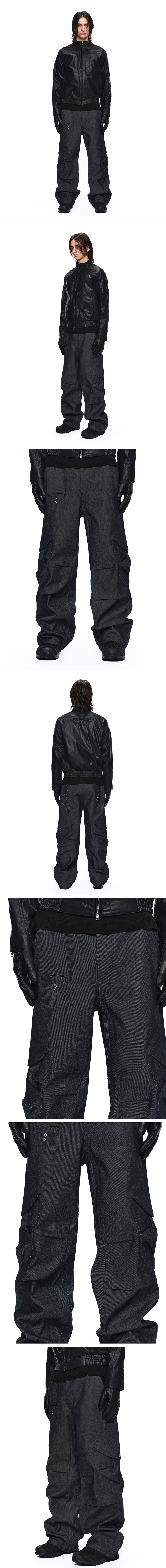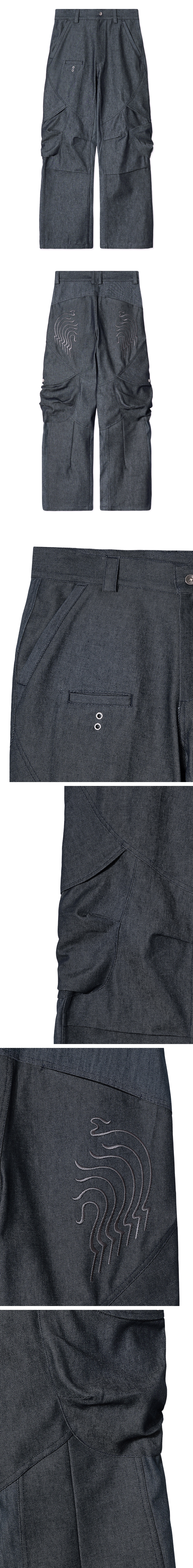이염 방지 데님 원단 YKK 지퍼 무릎 핀턱 디테일 측면 입체 카고 디자인 후면 자수 디테일