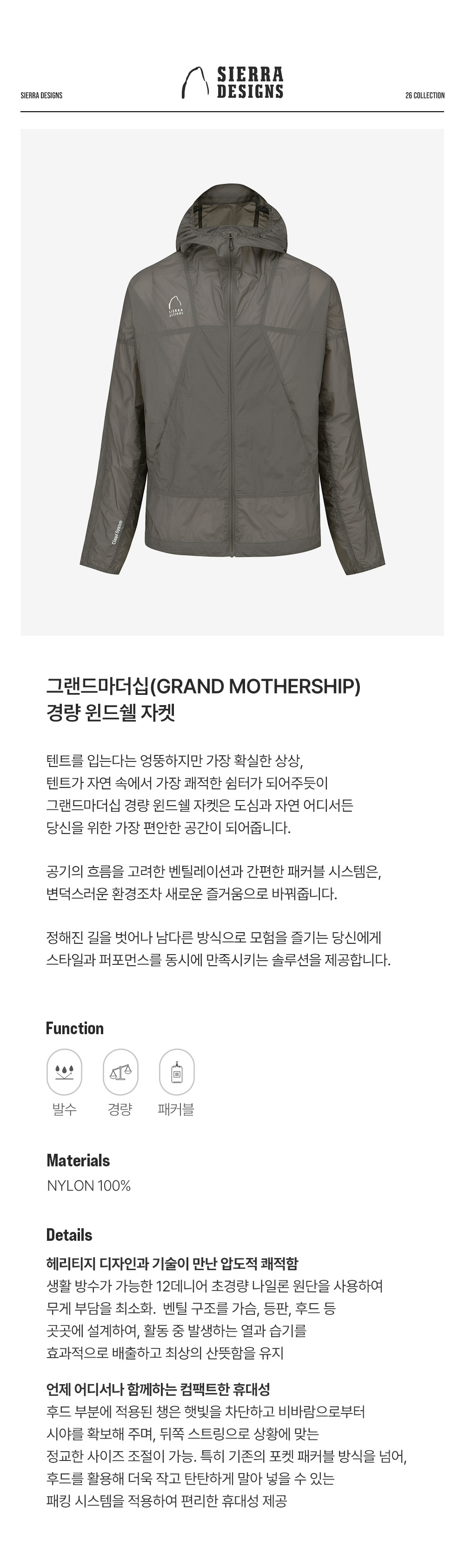 시에라디자인 그랜드마더십 경량 윈드쉘 자켓 다크 그레이