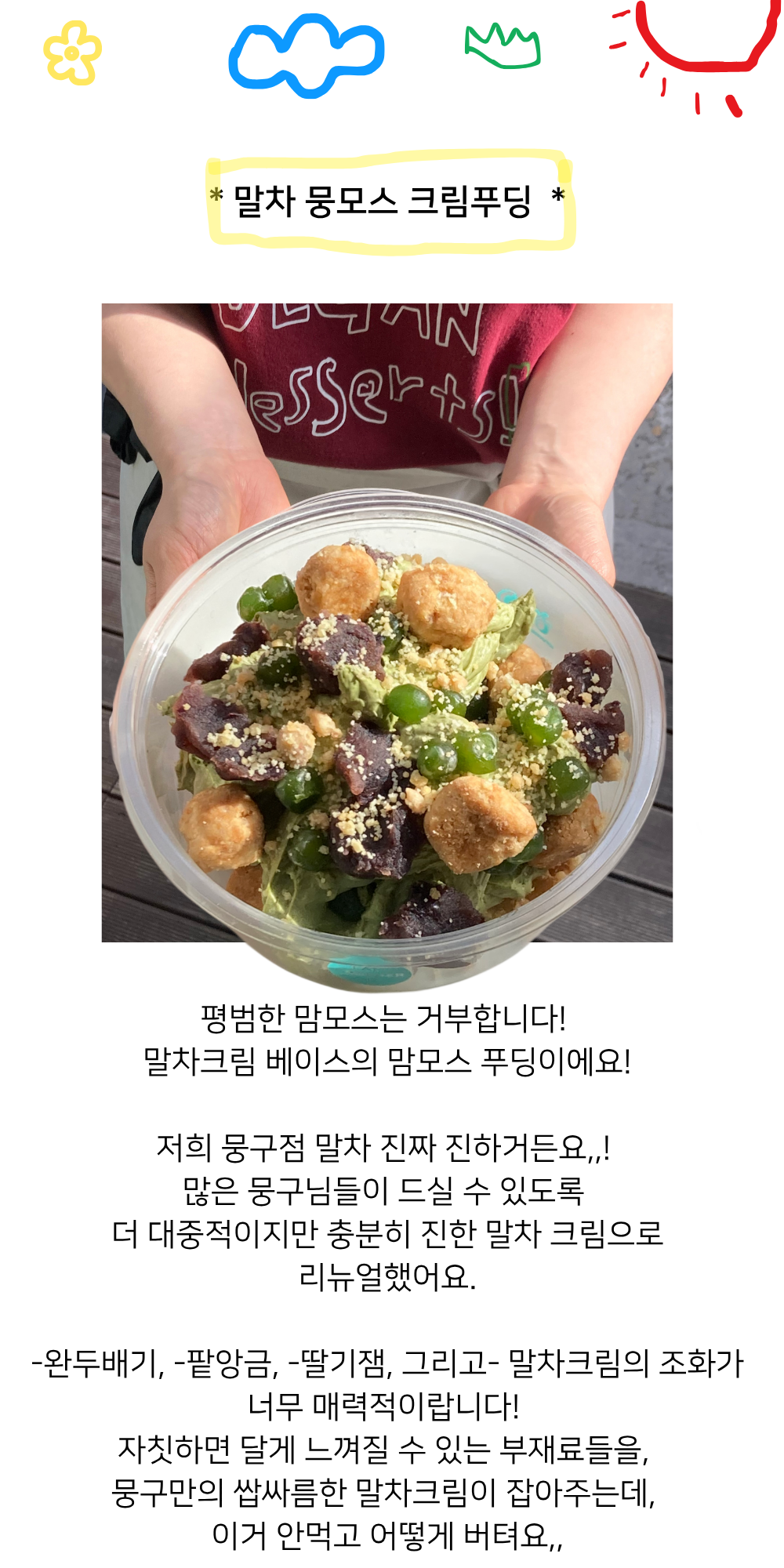 뭉하! 비건베이커리 뭉구점입니다. 공존과 공존의 가치를 실현하는 뭉구점을 믿고 주문해주셔서 감사합니다! [배송일정] -4/17-19일 주문 건 : 4/21-24 발송 -4/20-21 주문 건 : 4/22-25 발송 -4/22-24 주문 건 : 4/23-25 발송 ✔️ 발송 일정 지정 및 발송일 변경이 불가합니다. 옵션명 - 출고 예정일 참고 부탁드립니다. ✔️ 주문 폭주 시 안내된 일정 대비 제작 및 출고가 다소 지연될 수 있습니다. 변동 시 인스타그램으로 공지 올려드립니다! 꼭 확인 부탁드립니다. ✔️ 식품 디저트류 특성 상 "단순 변심"으로 인한 교환/환불 불가합니다. ✔️ 모든 상품은 주문 후 제작되며, 대량 생산 제품과 달리 수제 디저트로 생산 과정상 모양,색감,크기에 약간의 차이가 있을 수 있습니다. 이는 제품의 특성으로 불량에 해당하지 않습니다. ✔️ 주문 완료 후에는 옵션 변경, 주소 변경, 주문 취소가 불가하오니 신중한 구매 부탁드립니다. ✔️ 도서산간/제주 지역으로는 배송이 어렵습니다.
