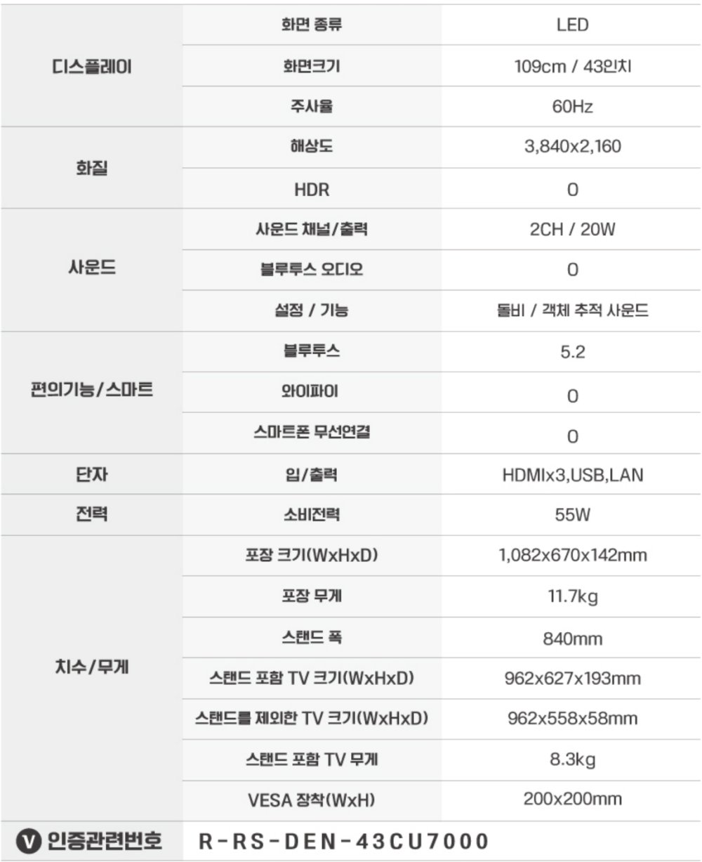 ![[S등급] 리퍼비시 삼성 43인치 최신형 UHD 4K 스마트TV 43CU7000 스탠드형 방문설치([S등급] Refurbished Samsung 43inch Latest UHD 4K Smart TV (43CU7000) – Stand Type, In-Home Installation Included) - 1](https://kream-phinf.pstatic.net/MjAyNjA0MDlfMjc3/MDAxNzc1NzE1ODg0MTM5.jKAbe6JtIt73h9MfBJsq3pVbQWjaty09nQ1l0Bqn8QIg.Ea3Q5cdeP4mR9Kgxto9YjeLqSgMSn6eWD0ZcMBKPxx8g.PNG/a_8fba930cb77f4eea911e99e51cdf2422.png)