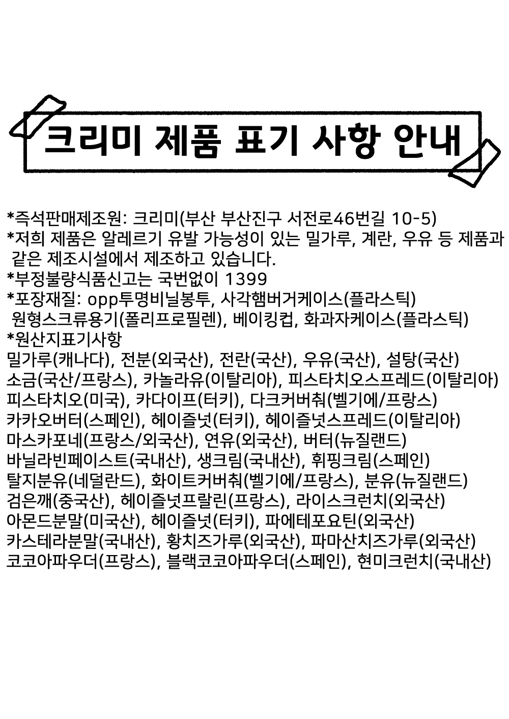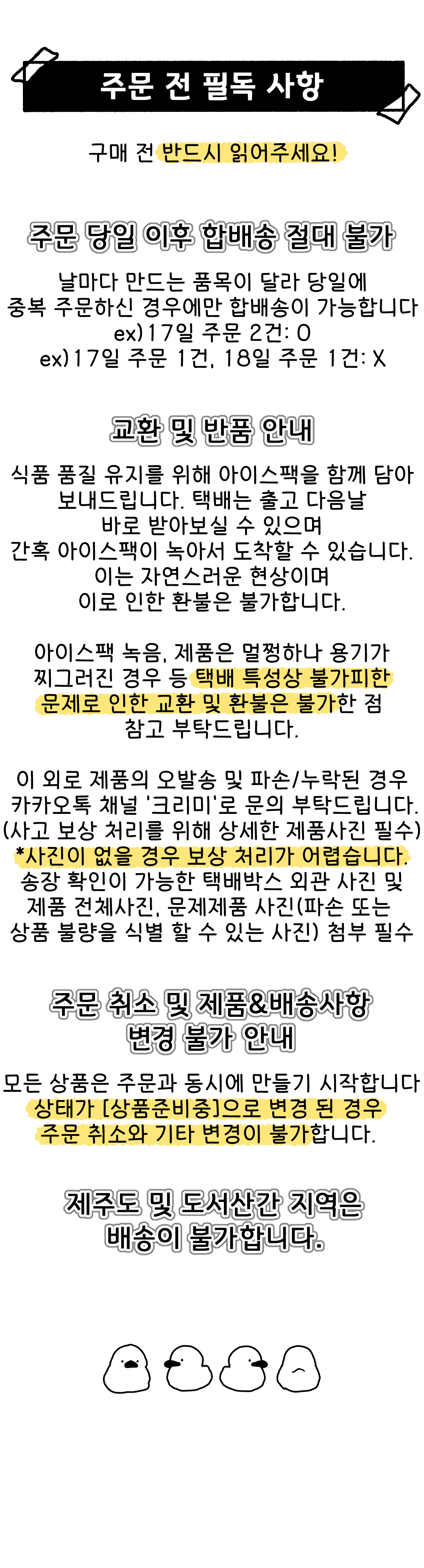 ✔️ 식품 디저트류 특성 상 "단순 변심"으로 인한 교환/환불 불가합니다. ✔️ 모든 상품은 주문 후 제작되며, 대량 생산 제품과 달리 수제 디저트로 생산 과정상 모양,색감,크기에 약간의 차이가 있을 수 있습니다. 이는 제품의 특성으로 불량에 해당하지 않습니다. ✔️ 발송 일정 지정 및 발송일 변경이 불가합니다. 옵션명 - 출고 예정일 참고 부탁드립니다. ✔️ 주문 완료 후에는 옵션 변경, 주소 변경, 주문 취소가 불가하오니 신중한 구매 부탁드립니다. ✔️ 주문 폭주 시 안내된 일정 대비 제작 및 출고가 다소 지연될 수 있습니다. ✔️ 도서산간/제주 지역으로는 배송이 어렵습니다. 주문 시 참고 부탁드립니다.