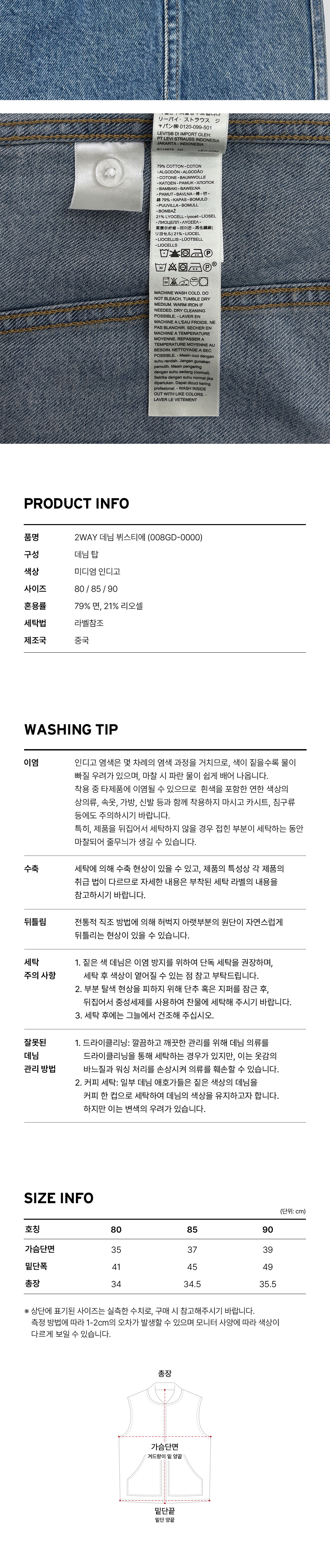리바이스 2WAY 데님 뷔스티에 미디엄 인디고