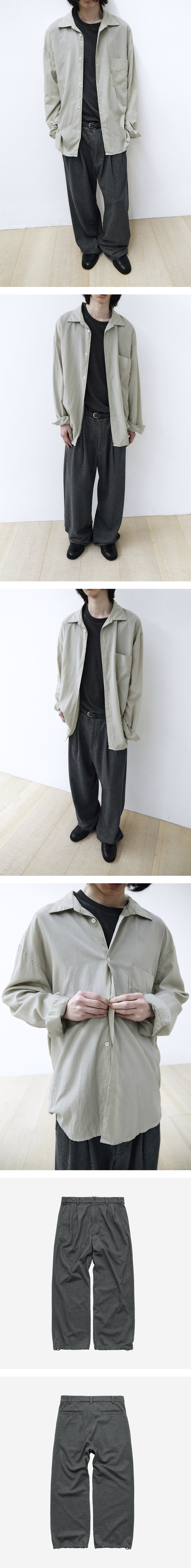 jersey trousers - 클래식한 트라우저 디자인을 기반으로 재해석된 스웨트팬츠 - 테일러블한 구성으로 완성된 팬츠로, 허리 안쪽은 트라우저를 연상시키는 질감의 원단을 적용 - 전면 투턱 디테일을 통한 유려한 실루엣 완성 - 허리 스트링을 통한 사이즈 조절 가능 - 밑단 스트링을 통한 실루엣 조절 가능 *모델: 178cm, 마른 체형 / 3사이즈 착용
