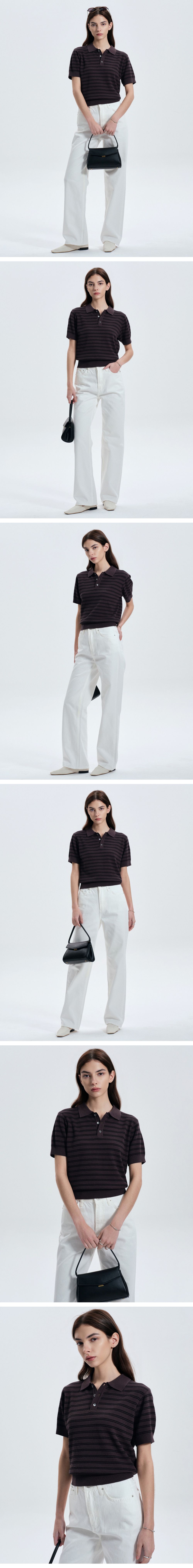티엔지티 우먼 스트라이프 폴로 워셔블 니트 그레이시브라운