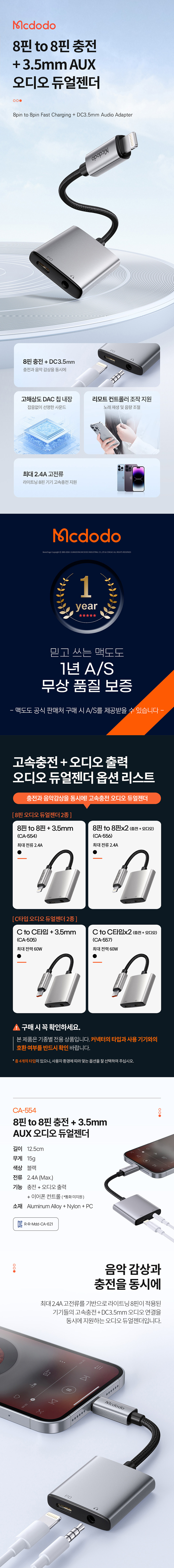 맥도도 8핀 to 8핀 충전+3.5mm AUX 오디오 듀얼젠더 CA554