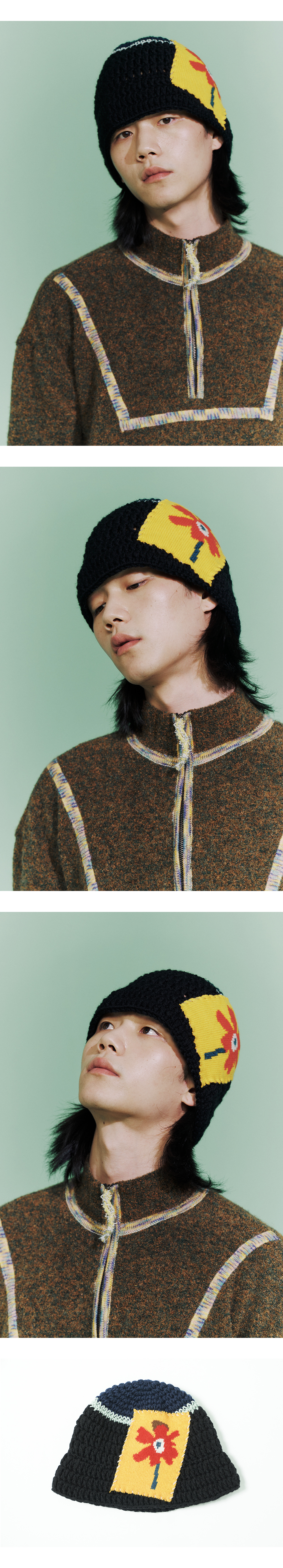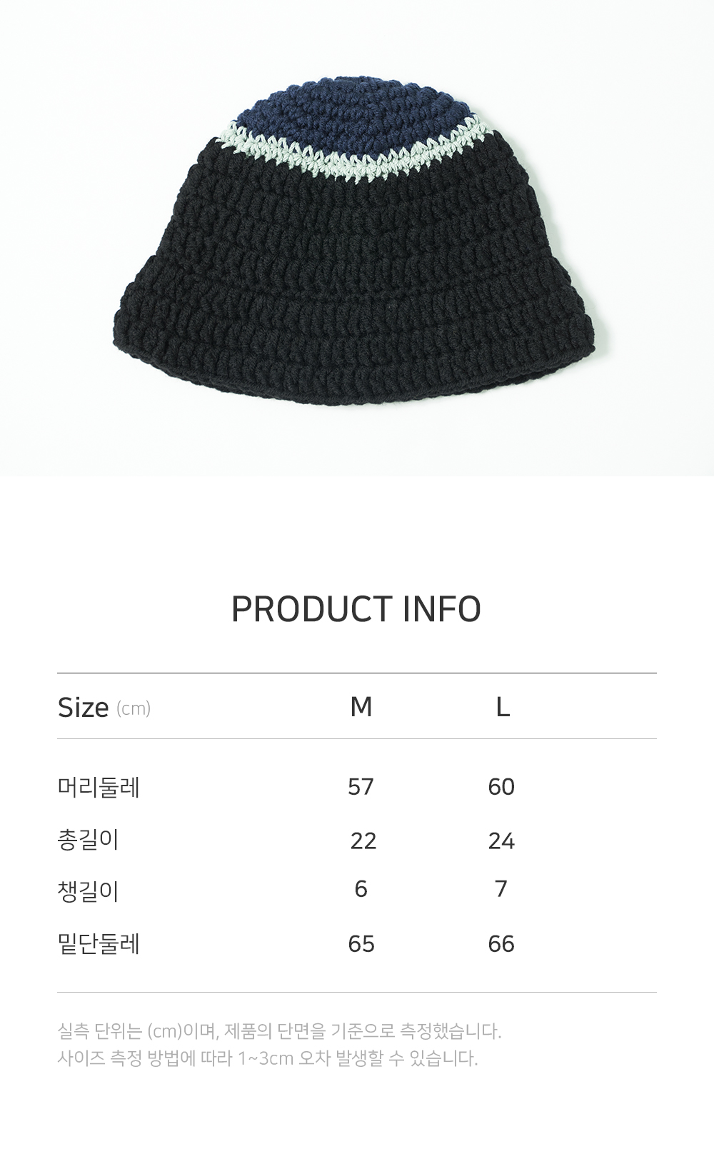 - 100% 핸드메이드입니다. - 미수아바흐브의 시그니처 버킷 햇입니다. - 니트 패치를 핸드 스티칭 한 디테일이 포인트입니다. - 헤드 톱 부분과 바디 부분의 배색이 특징입니다.