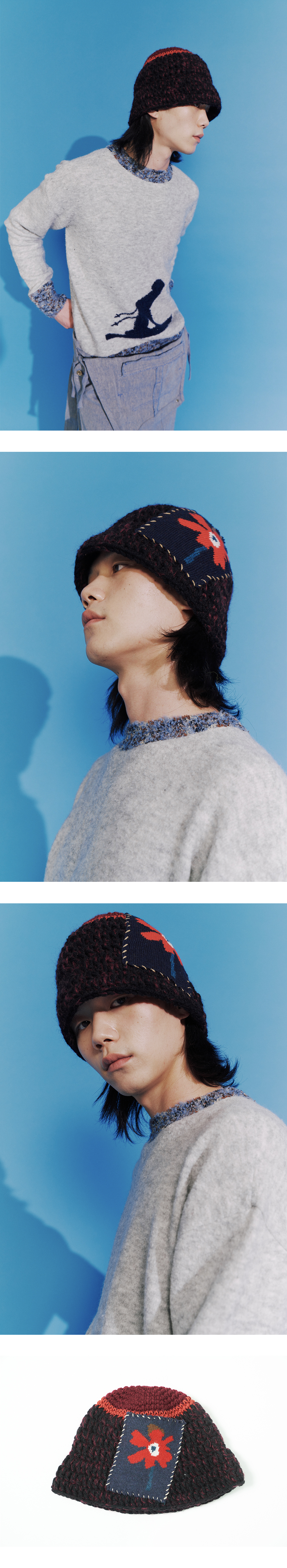 - 100% 핸드메이드입니다. - 미수아바흐브의 시그니처 버킷 햇입니다. - 니트 패치를 핸드 스티칭 한 디테일이 포인트입니다. - 헤드 톱 부분과 바디 부분의 배색이 특징입니다.