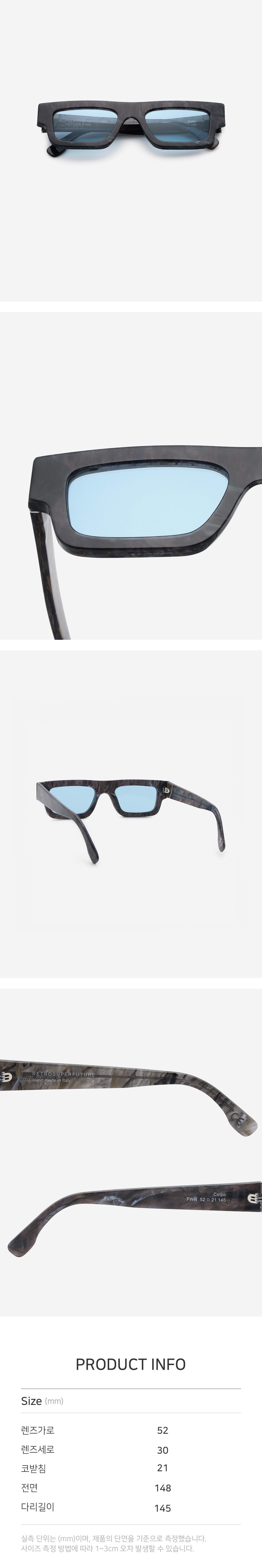 *안경테에 장착되어있는 렌즈는 프레임의 형태의 변형을 막기 위한 플라스틱 데모렌즈입니다. 데모렌즈의 미세한 스크래치는 불량사유가 될 수 없습니다.
