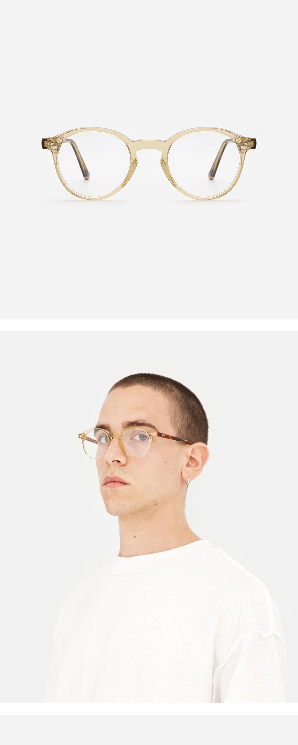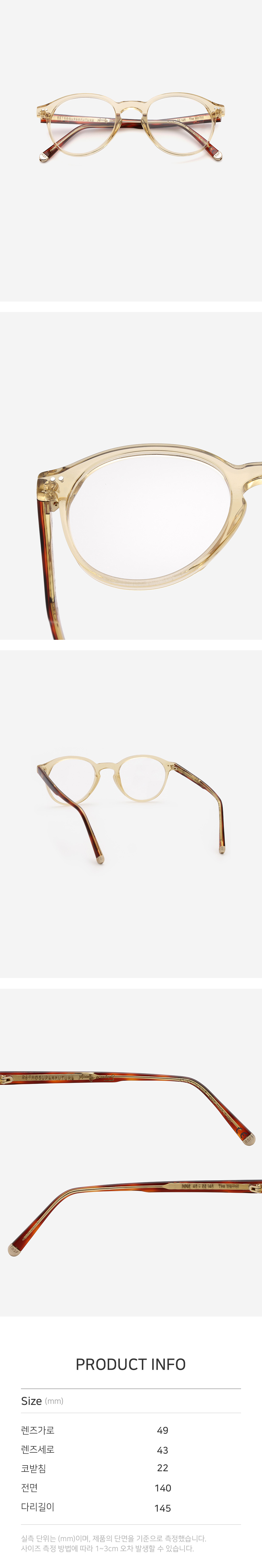 *안경테에 장착되어있는 렌즈는 프레임의 형태의 변형을 막기 위한 플라스틱 데모렌즈입니다. 데모렌즈의 미세한 스크래치는 불량사유가 될 수 없습니다.