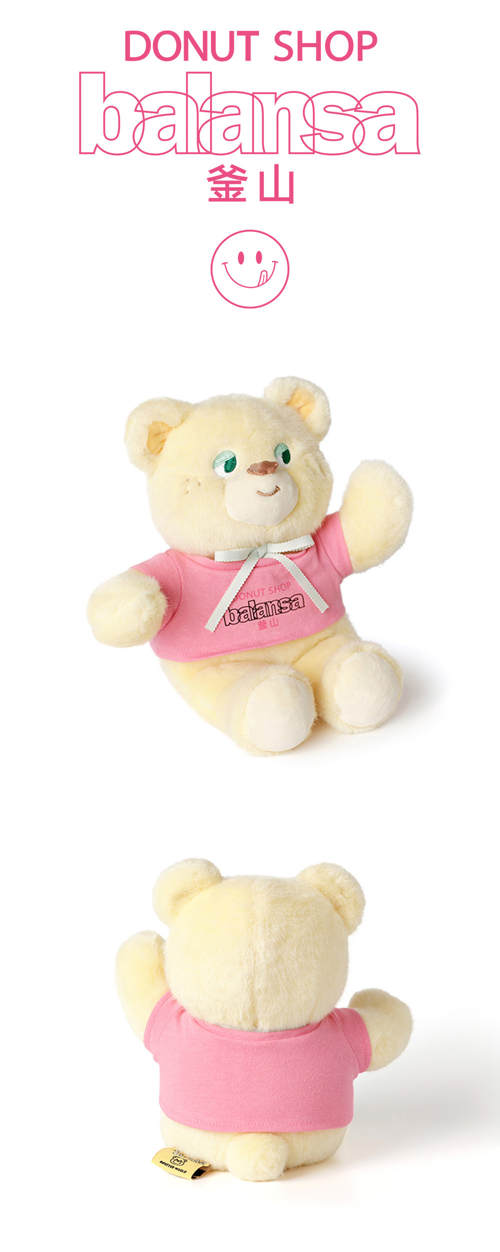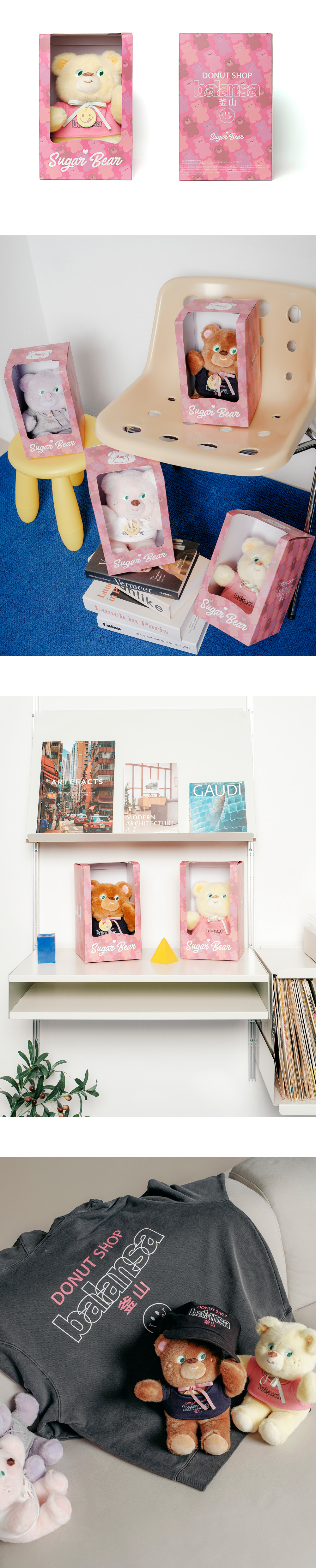 노티드의 슈가베어 인형이 발란사를 만나 'Donut shop, Balansa' 그래픽 티셔츠를 입었습니다. 해당 상품은 콜라보레이션 아트워크가 인쇄된 페이퍼 박스로 패키징 되어 출고됩니다.