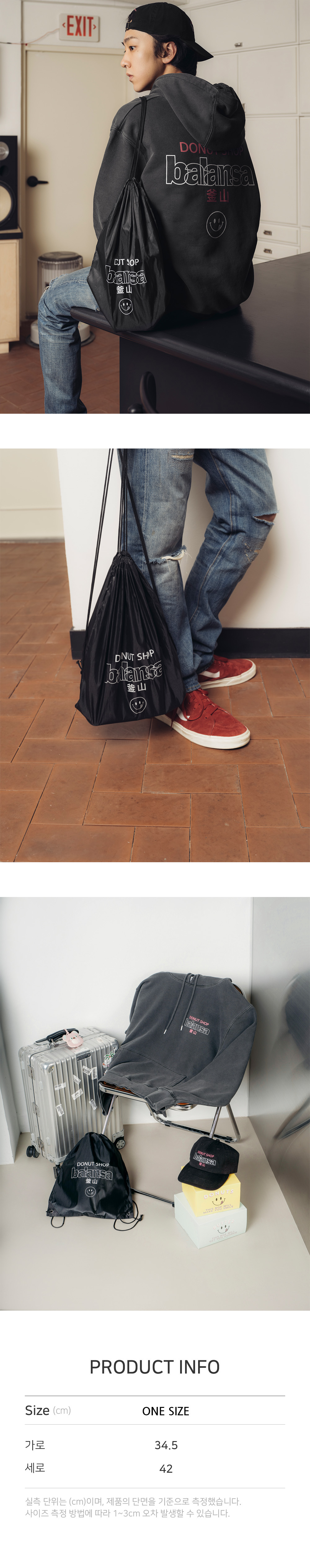 노티드와 발란사의 만남을 의미하는 'Donut shop, Balansa' 그래픽을 프린팅 한 짐색으로 간단한 소지품을 보관하기 용이한 제품입니다.