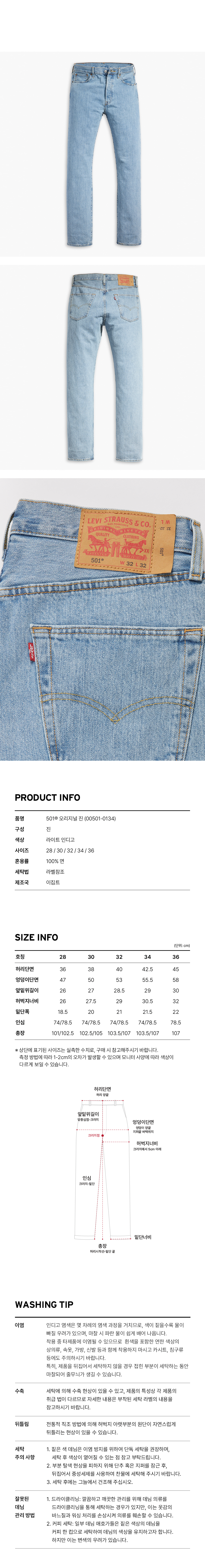 Levi's의 501 오리지널 진입니다. 클래식 스트레이트 피팅감에 아이코닉한 스타일링이 돋보이는 제품입니다. 1873년 첫 출시된 이후 한번도 유행이 아니었던 적이 없었던 리바이스의 상징적인 제품입니다.