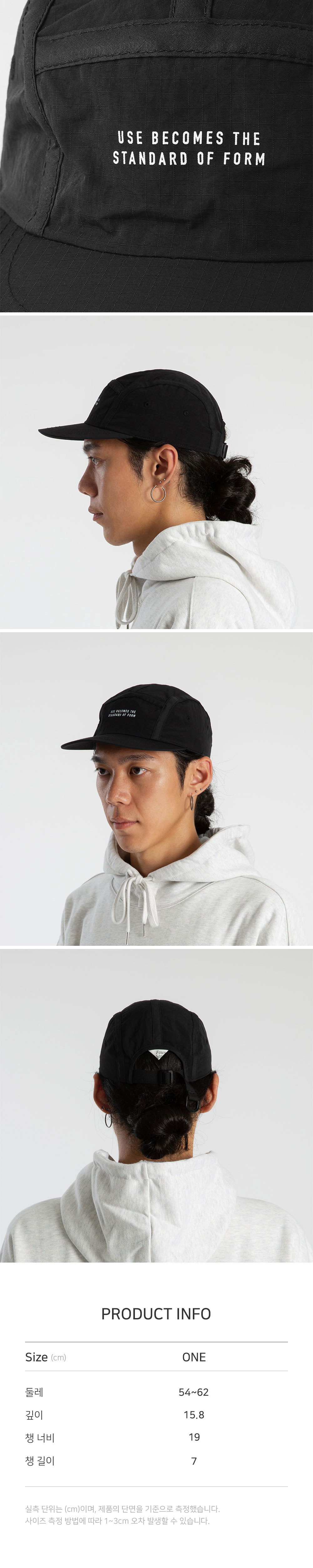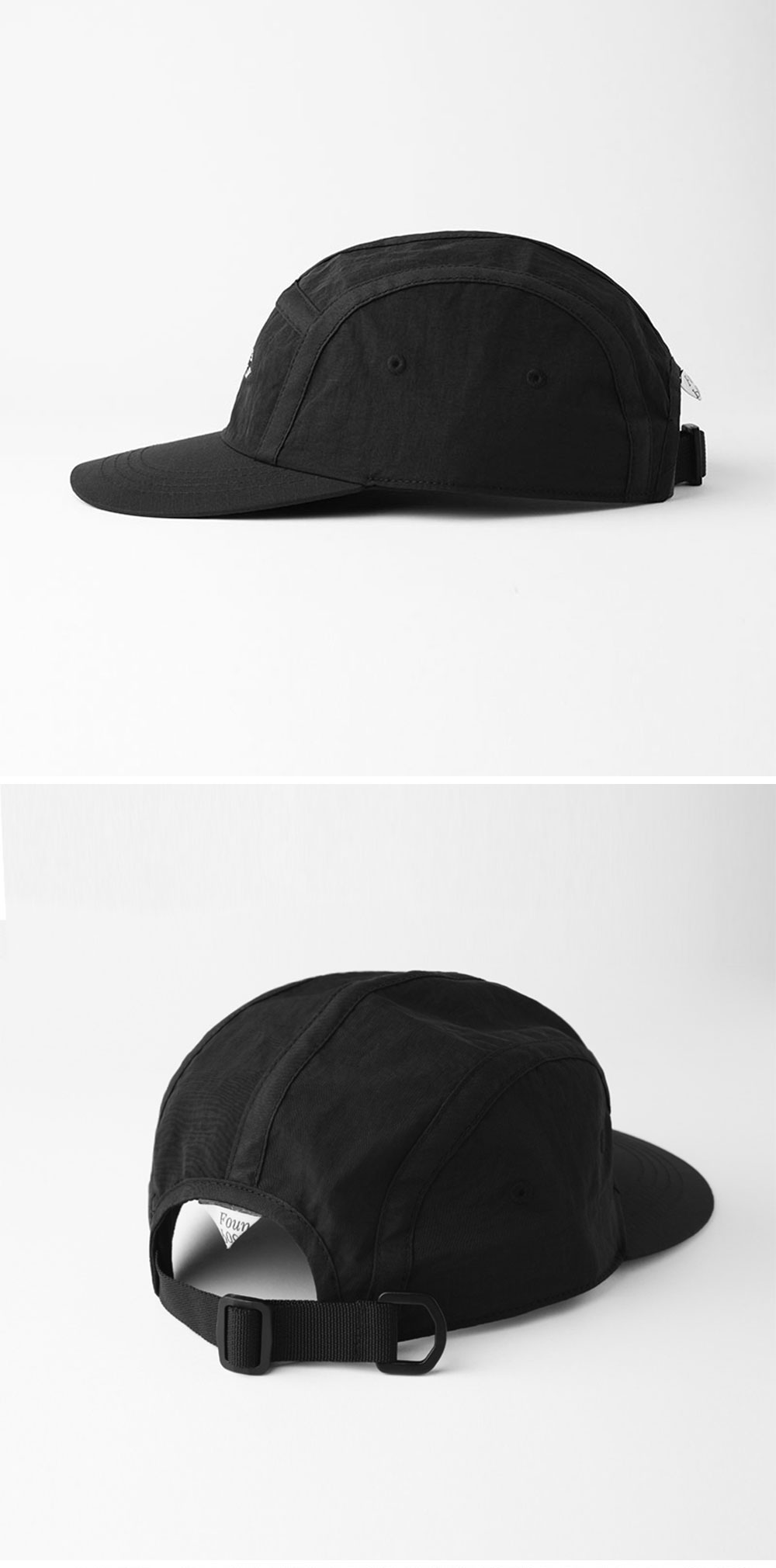 PRODUCT: CAP COLOR: BLACK OUTSHELL: NYLON 100% LINING: NYLON 100% 카세트테이프 A, B 사이드에서 착안한 캠프 캡. 모자 내부 디테일을 바깥으로 보이도록 뒤집은 B 사이드 디자인. 모자 외부에 파운드 포켓의 슬로건 “USE BECOMES THE STANDARD OF FORM” 프린트. 후면 사이즈 조절 방식은 웹 락과 D 링을 활용. 삼각형의 메인 라벨을 달아 뒷모습까지 특별하게 디자인. 고밀도 방직 된 립스탑 원단 사용.