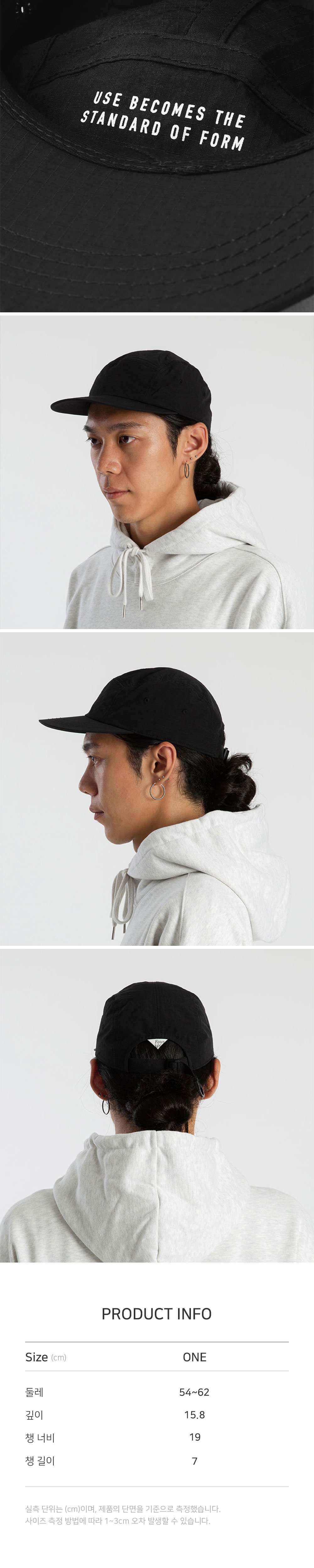 PRODUCT: CAP COLOR: BLACK OUTSHELL: NYLON 100% LINING: NYLON 100% 카세트테이프 A, B 사이드에서 착안한 캠프 캡. 외부 디테일을 최소화하여 깔끔한 이미지의 A 사이드 디자인. 모자 내부에 파운드 포켓의 슬로건 “USE BECOMES THE STANDARD OF FORM” 프린트. 후면 사이즈 조절 방식은 웹 락과 D 링을 활용. 삼각형의 메인 라벨을 달아 뒷모습까지 특별하게 디자인. 고밀도 방직 된 립스탑 원단 사용.