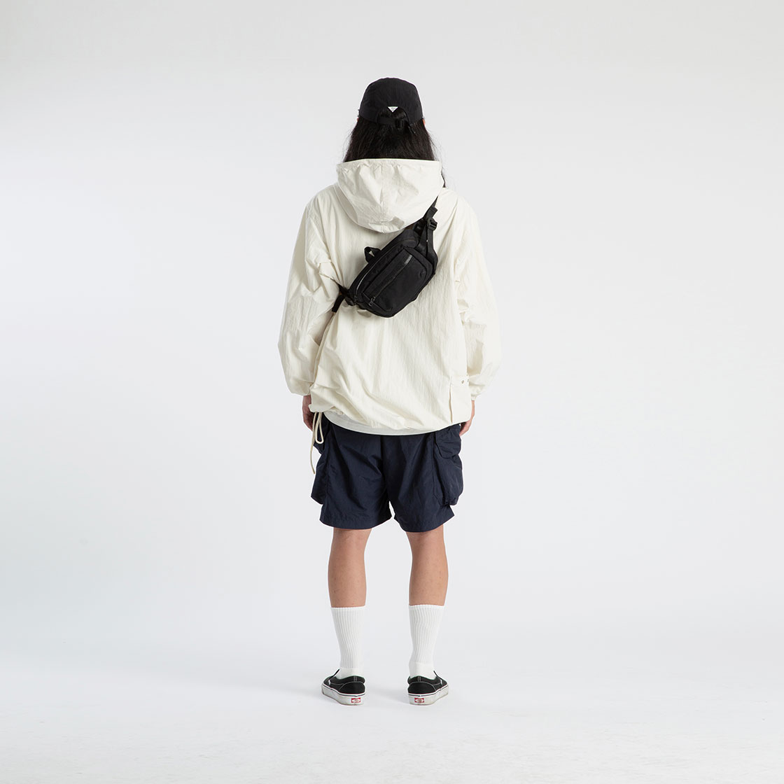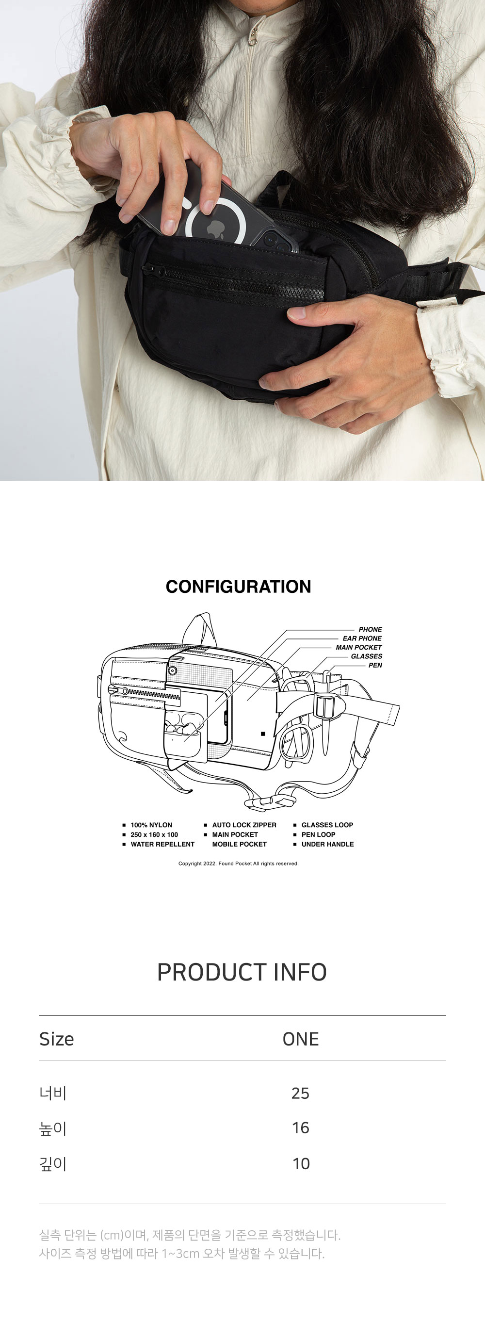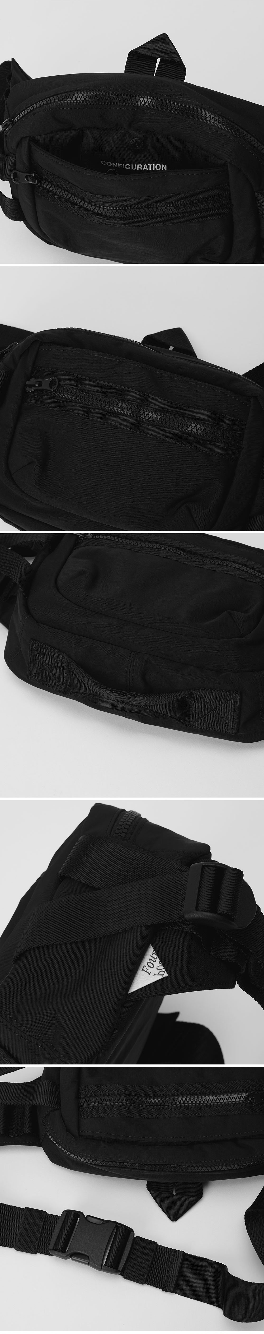PRODUCT: CROSS BAG COLOR: BLACK SIZE: W:25cm L:16cm D:10cm OUTSHELL: NYLON 100% LINING: NYLON 100% 카메라 케이스 형태의 작은 크로스백. 덮개 지퍼 포켓. 덮개 아래 미들 포켓. 메인 포켓. 다양한 방식으로 활용 가능한 어깨 끈과 D 링. 발수 가공 된 고밀도 나일론 원단 사용. ***해당 제품은 지퍼 폴리 백에 포장되어 발송됩니다. 지퍼 폴리 백 특성상 제품에 파우더 가루가 묻어날 수 있으며 제품에 묻은 파우더 가루는 살살 털어주시면 사라지니 구매 시 참고 부탁드립니다.