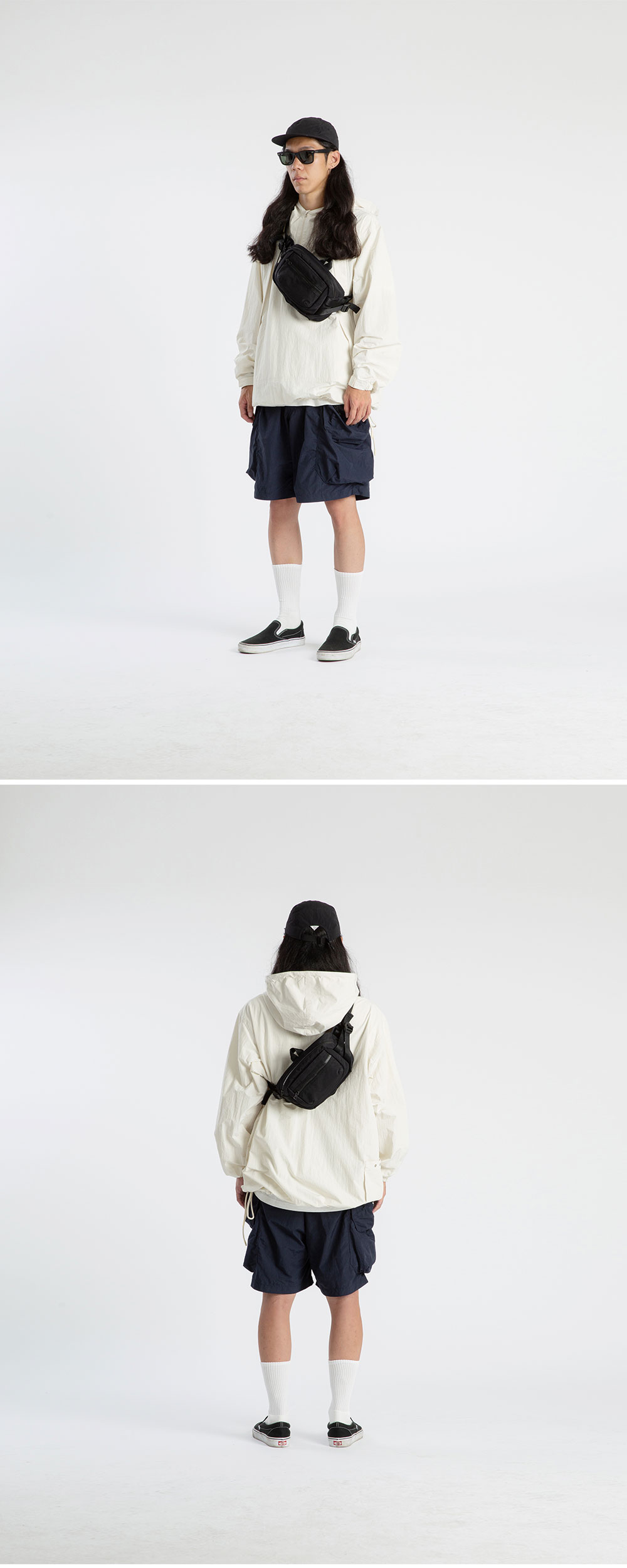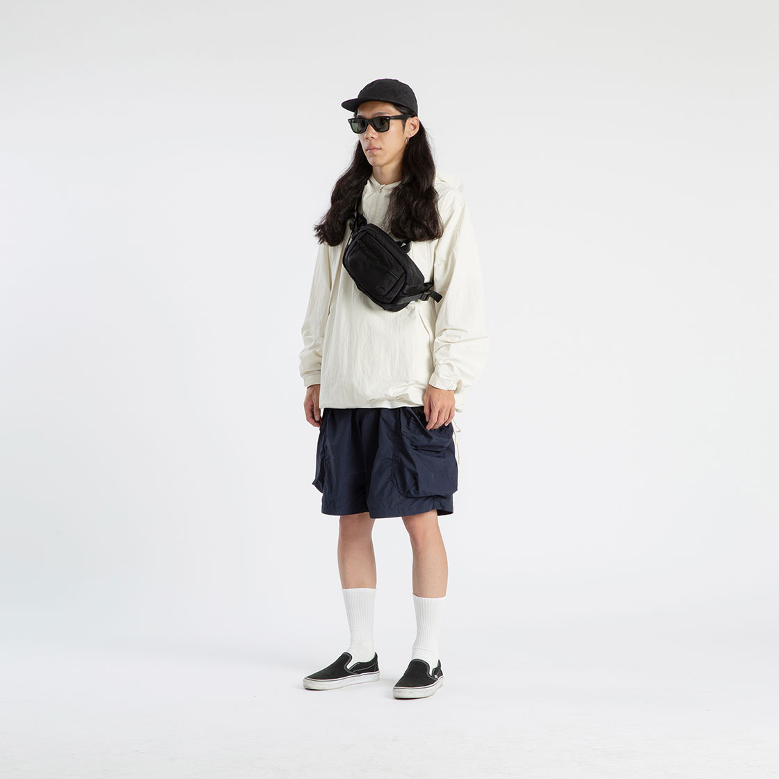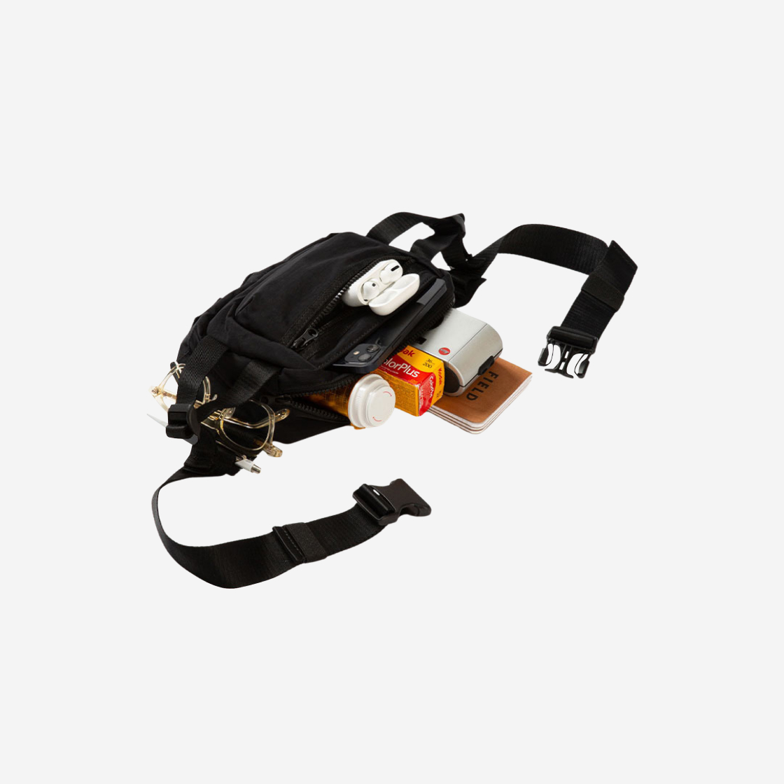 PRODUCT: CROSS BAG COLOR: BLACK SIZE: W:25cm L:16cm D:10cm OUTSHELL: NYLON 100% LINING: NYLON 100% 카메라 케이스 형태의 작은 크로스백. 덮개 지퍼 포켓. 덮개 아래 미들 포켓. 메인 포켓. 다양한 방식으로 활용 가능한 어깨 끈과 D 링. 발수 가공 된 고밀도 나일론 원단 사용. ***해당 제품은 지퍼 폴리 백에 포장되어 발송됩니다. 지퍼 폴리 백 특성상 제품에 파우더 가루가 묻어날 수 있으며 제품에 묻은 파우더 가루는 살살 털어주시면 사라지니 구매 시 참고 부탁드립니다.