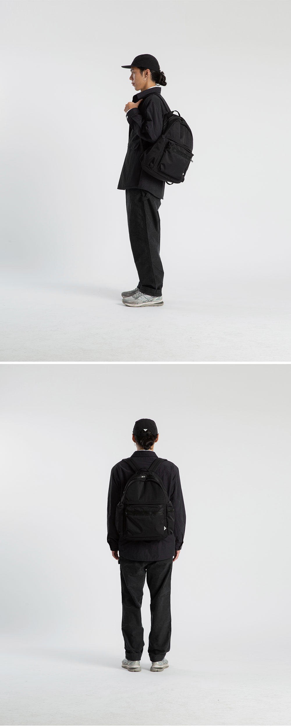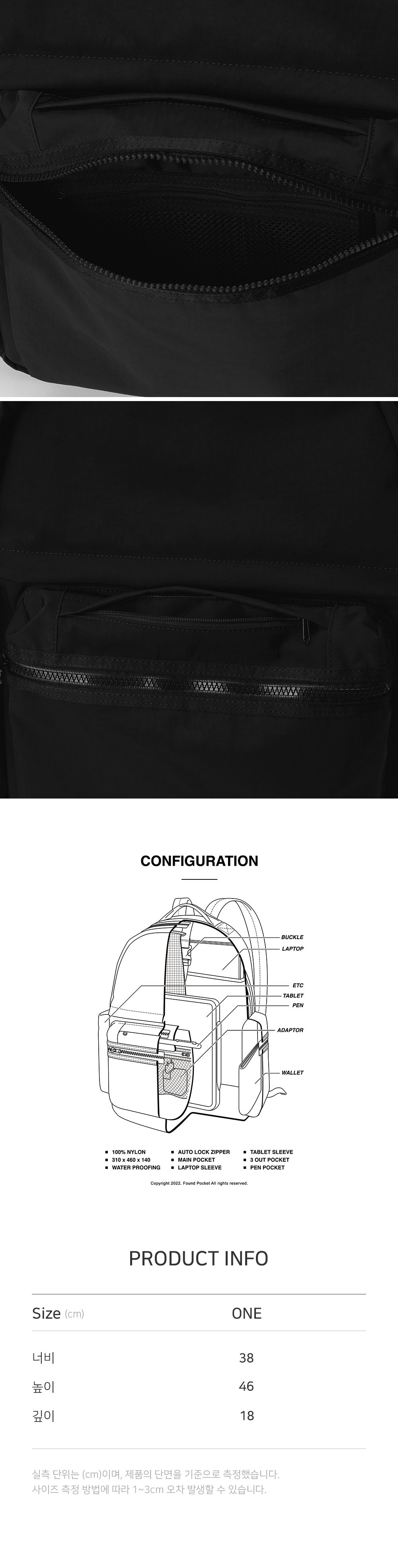 PRODUCT: BACKPACK COLOR: BLACK SIZE: W:38cm L:46cm D:18cm OUTSHELL: NYLON 100% LINING: NYLON 100% 넉넉한 메인 포켓. 버클 여밈 방식의 랩톱 슬리브. 미들 지퍼 태블릿 포켓. 전면 포켓 내, 외부 펜포켓과 메시 포켓. 각기 다른 오픈 방식의 사이드포켓. 직장인과 학생의 소지품에 특화되어있는 백팩 디자인. 발수 가공 된 고밀도 나일론 원단 사용. *** 해당 제품은 지퍼 폴리 백에 포장되어 발송됩니다. 지퍼 폴리 백 특성상 제품에 파우더 가루가 묻어날 수 있으며 제품에 묻은 파우더 가루는 살살 털어주시면 사라지니 구매 시 참고 부탁드립니다.