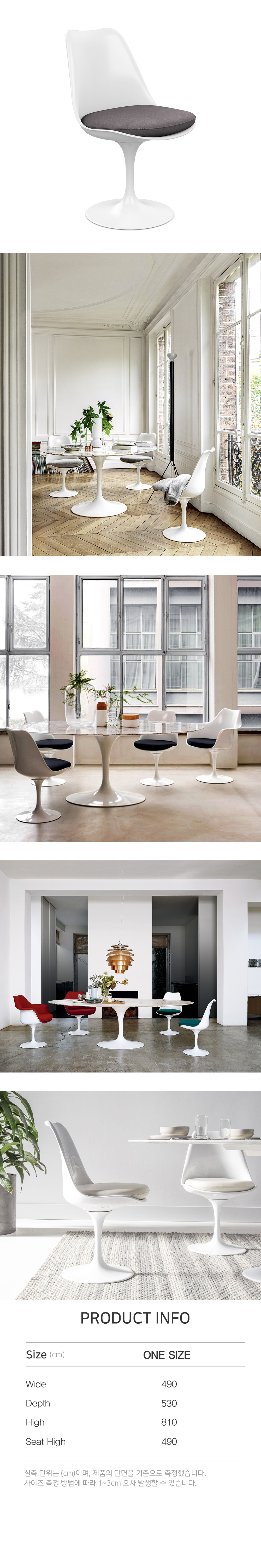 Eero Saarinen이 디자인한 Tulip Chair는 튤립 모양의 형태가 특징적입니다. 하나의 기둥으로 지지되는 다리 형태가 우아하면서도 심플한 곡선 라인으로 디자인 되었습니다. 울로 짜여진 패브릭 시트가 조화롭게 이루어집니다. Tulip Dining Table과 함께 세트 구성으로 스타일있는 공간을 완성할 수 있습니다