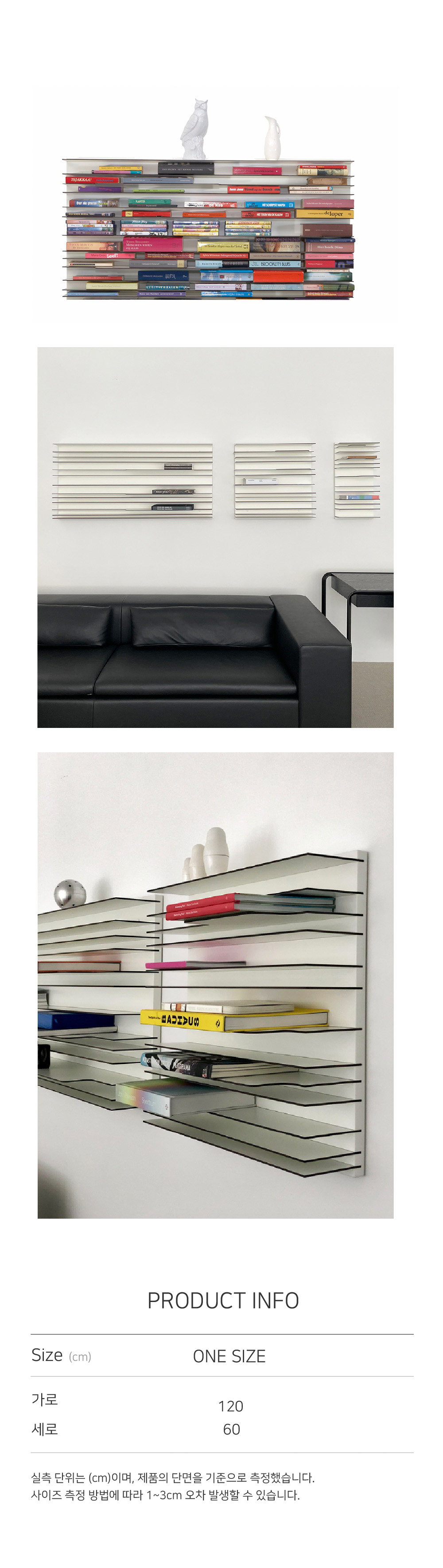 페이퍼백 월시스템은 길이와 옵션에 따라 변화하는 다양한 가능성을 품고 있습니다. 한 권의 책은 물론, 전체 벽면을 오브제로 가득 채우면 페이퍼백 월시스템이 책의 향기를 온 방안에 전달해줍니다. 색상은 화이트와 앤트러사이트 두 가지 컬러로 제작 가능하며 60cm의 고정된 높이에 너비는 30, 60, 120cm의 세 가지 사이즈를 가지고 있습니다. 벽의 뒷 부분은 4개의 나사로 고정되며 13개의 선반을 배치할 수 있습니다. 3개의 선반은 ‘tab’이라고 불리는 서류파일 속 디바이더 역할의 여유 공간을 가지고 있어 큰 사이즈의 책과 잡지들을 놓을 수 있습니다.