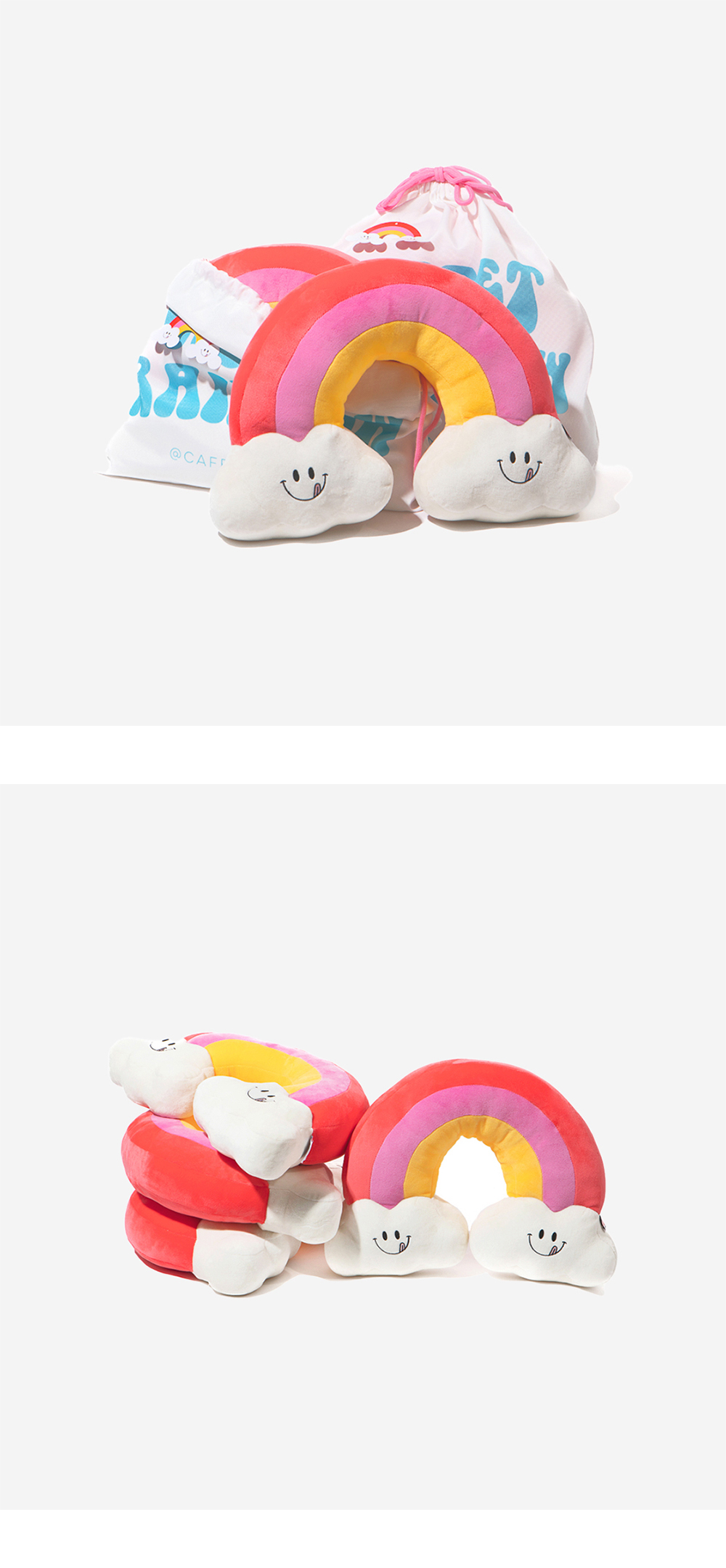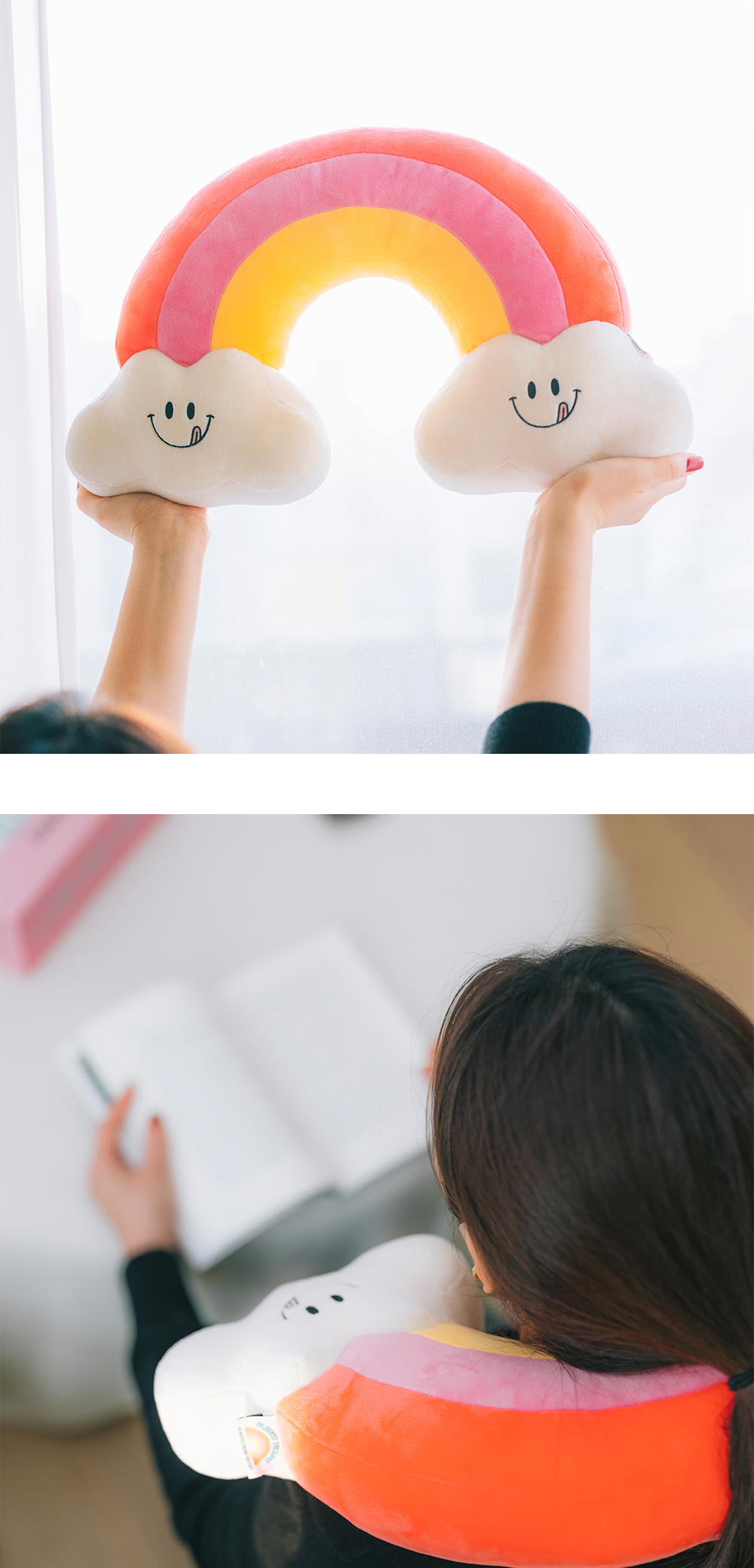 폭신한 구름과 무지개가 만나 포인트가 되는 노티드 레인보우 목쿠션, 실내 뿐 아니라 차량에서도 여행용으로도 쓰기 좋은 데일리 & 트래블 아이템이에요.