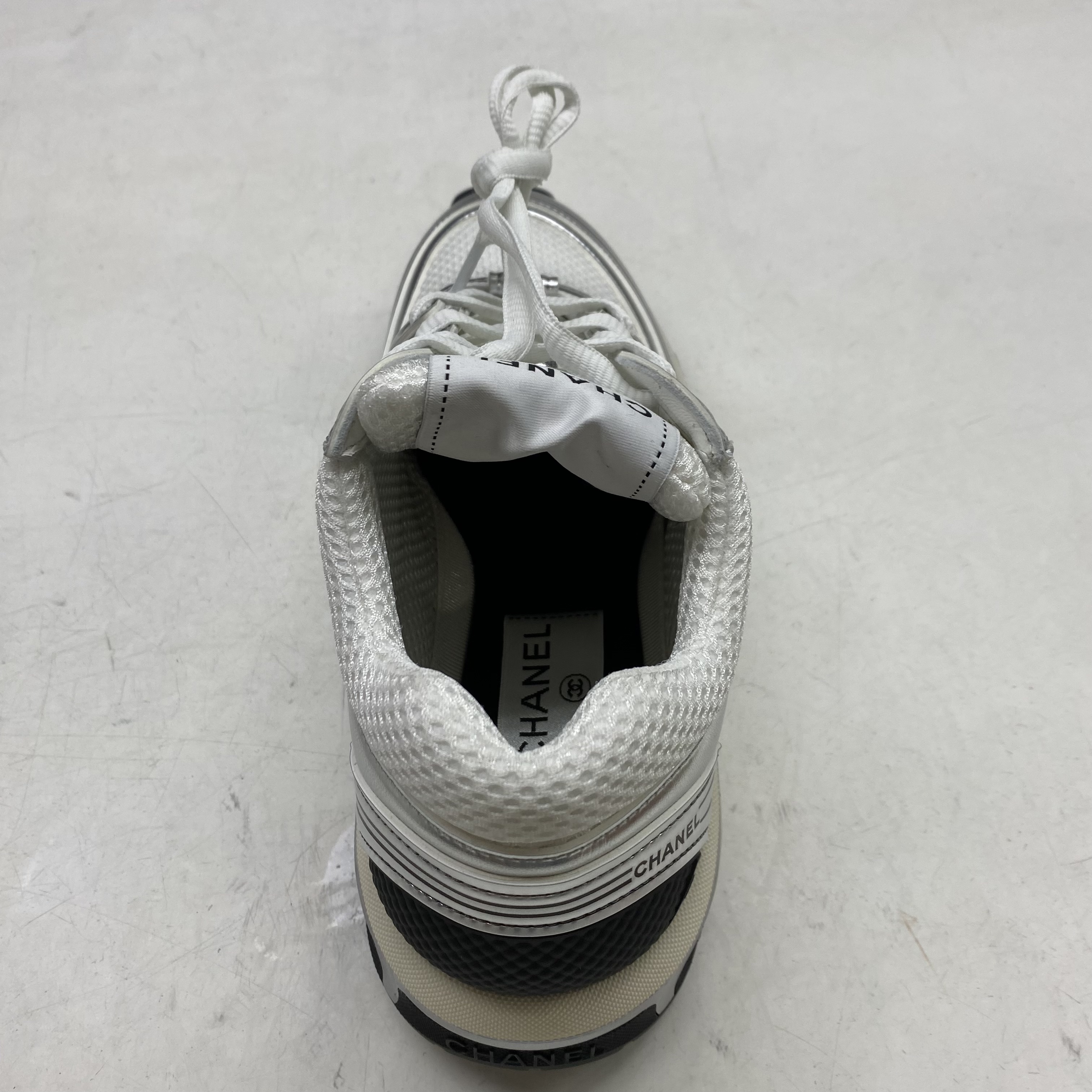 (W) Chanel Sneakers Fabric Laminated & White Silver