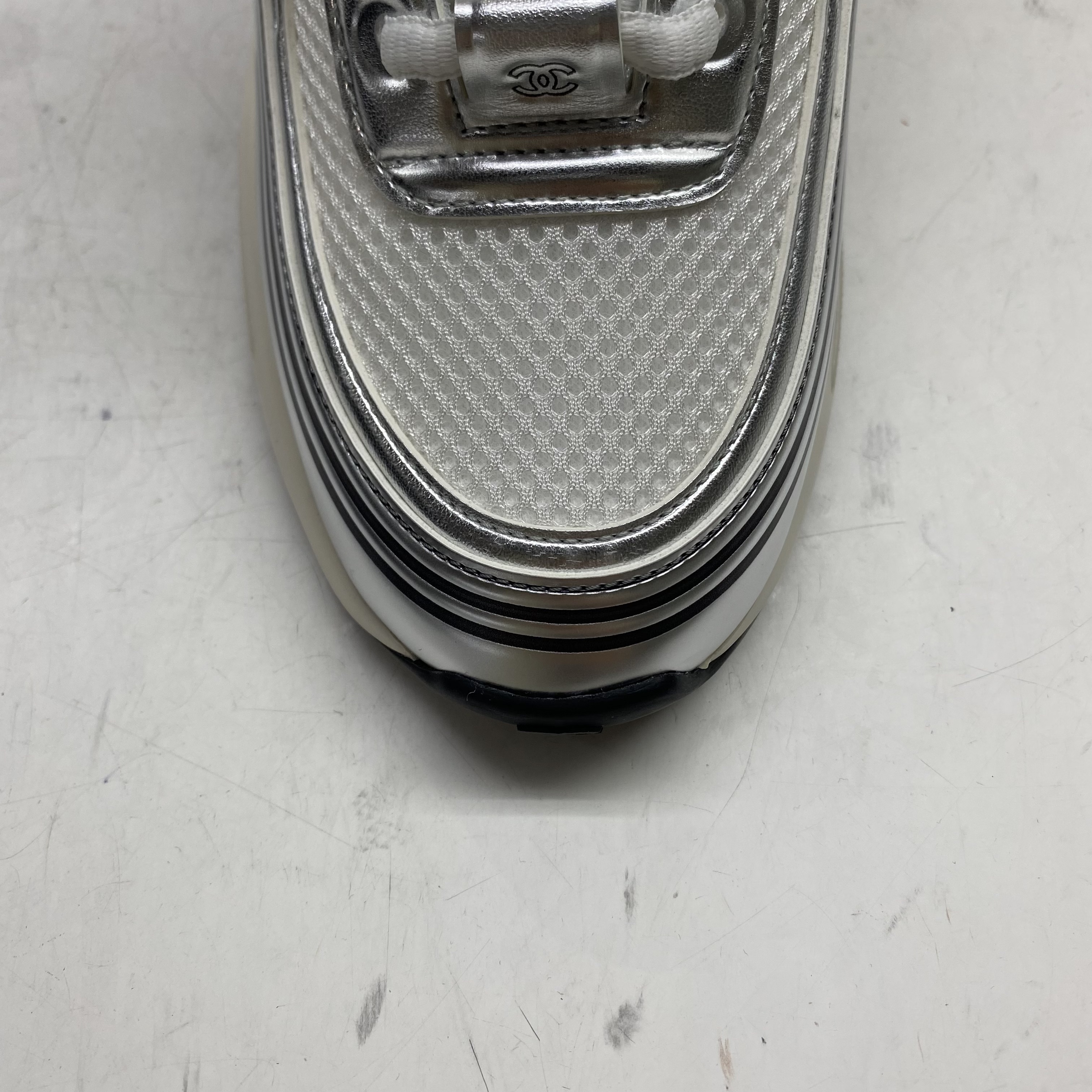 (W) Chanel Sneakers Fabric Laminated & White Silver
