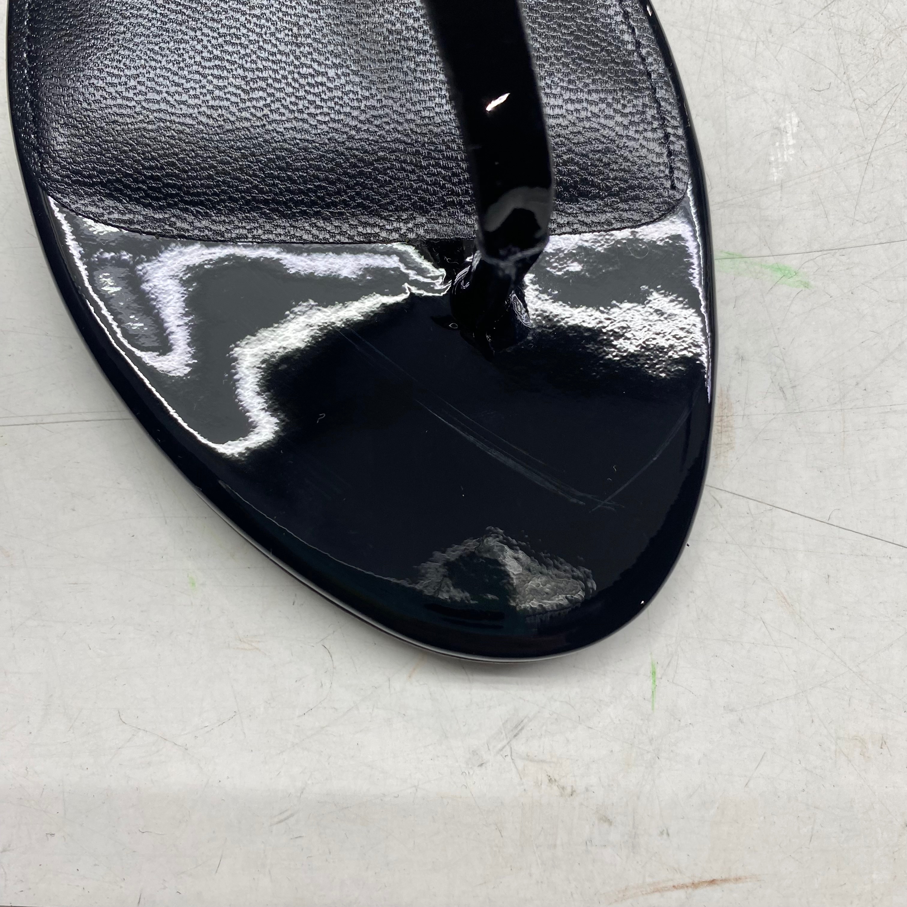 (W) 생로랑 페이턴트 레더 골드 모노그램 카산드라 플랫 샌들 블랙