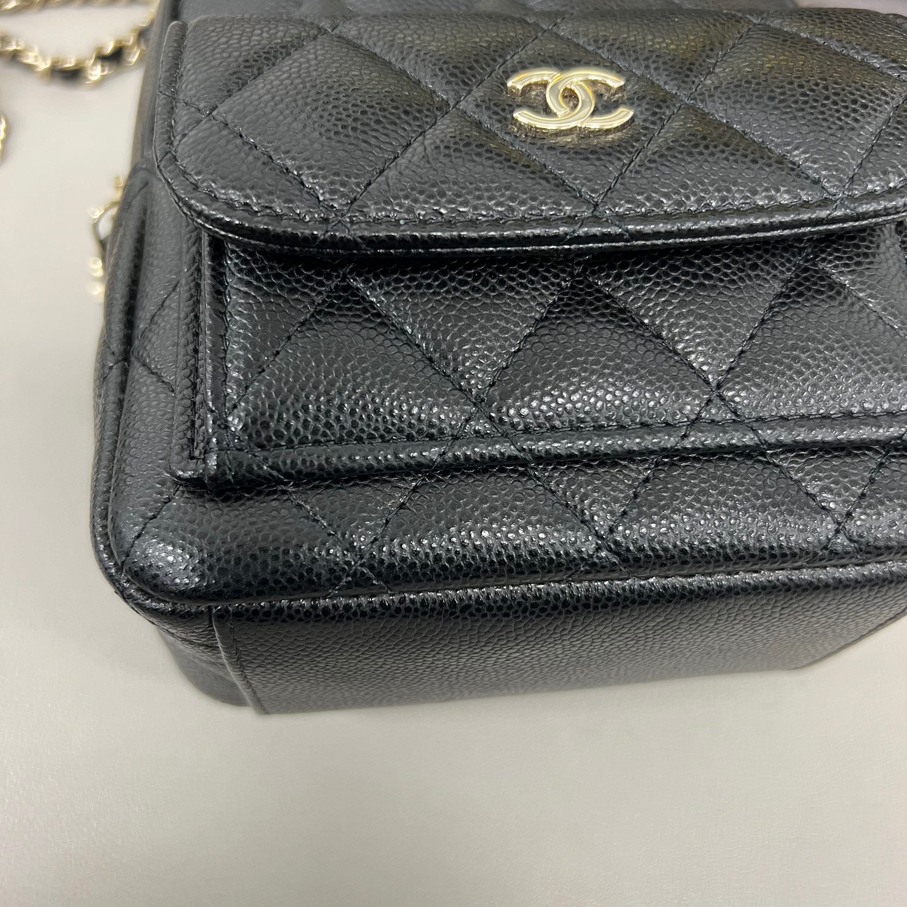 샤넬 클래식 핸드폰 홀더 체인 달린 샤이니 카프스킨 & 골드 메탈 블랙