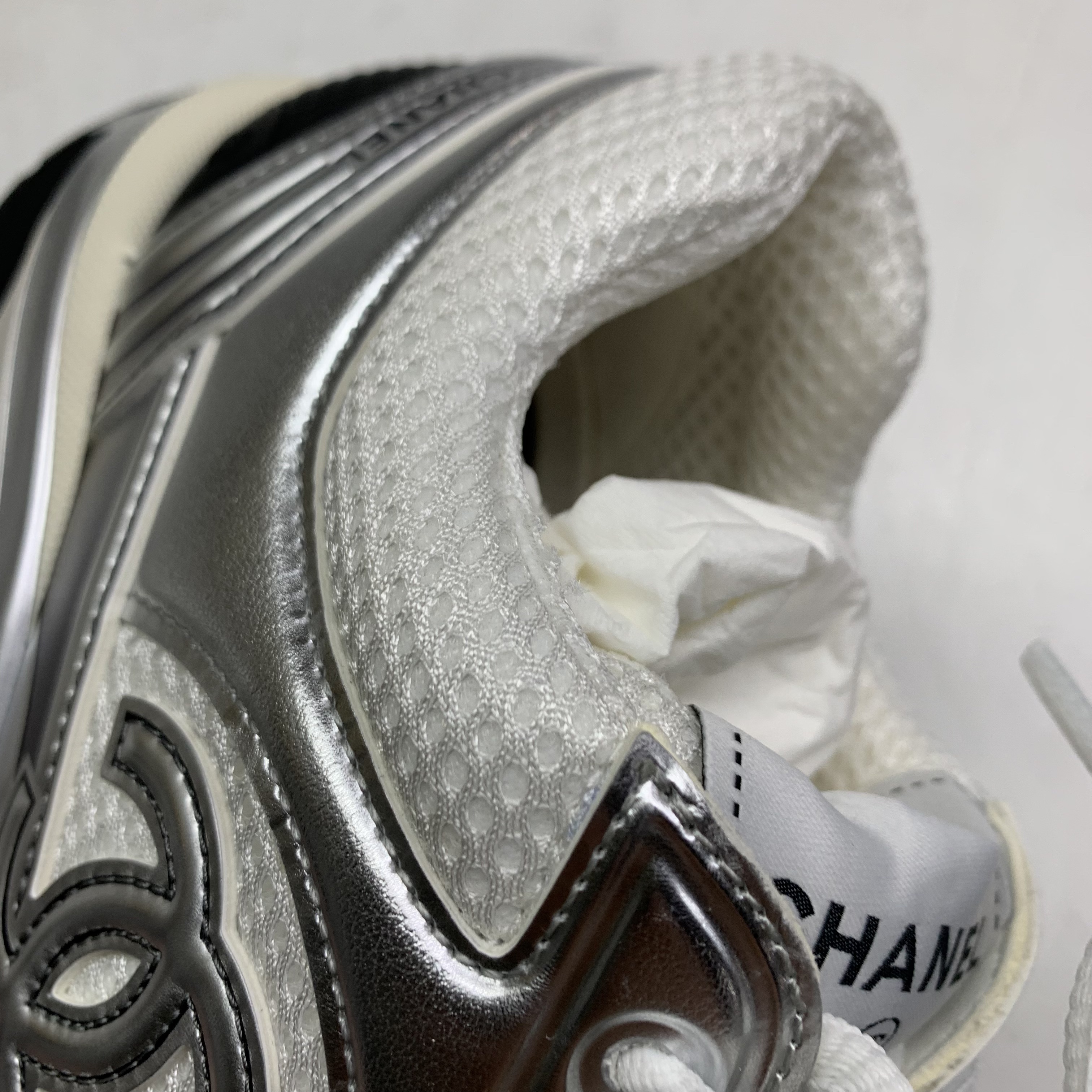 (W) Chanel Sneakers Fabric Laminated & White Silver