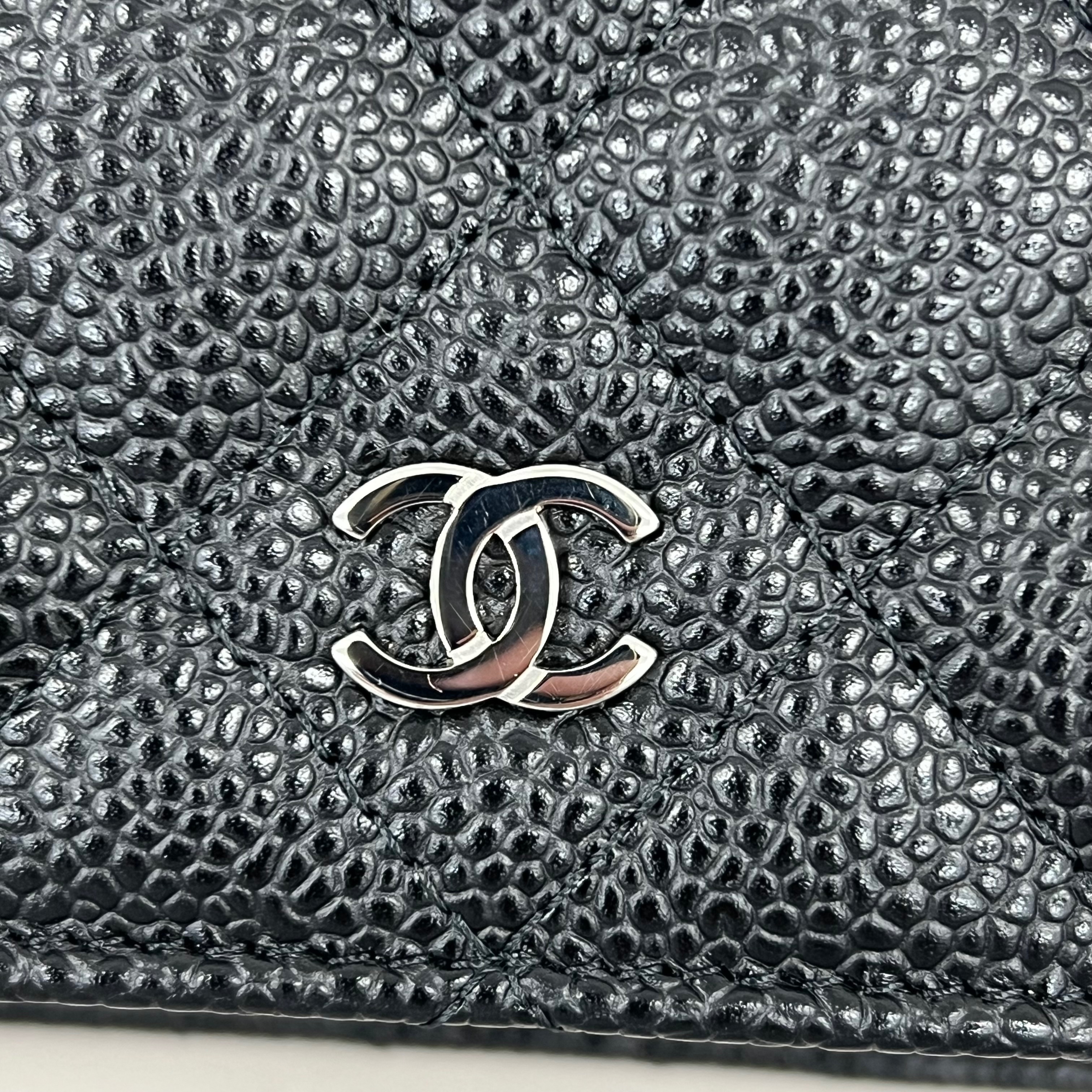샤넬 클래식 체인 지갑 그레인드 카프스킨 & 실버 메탈 블랙
