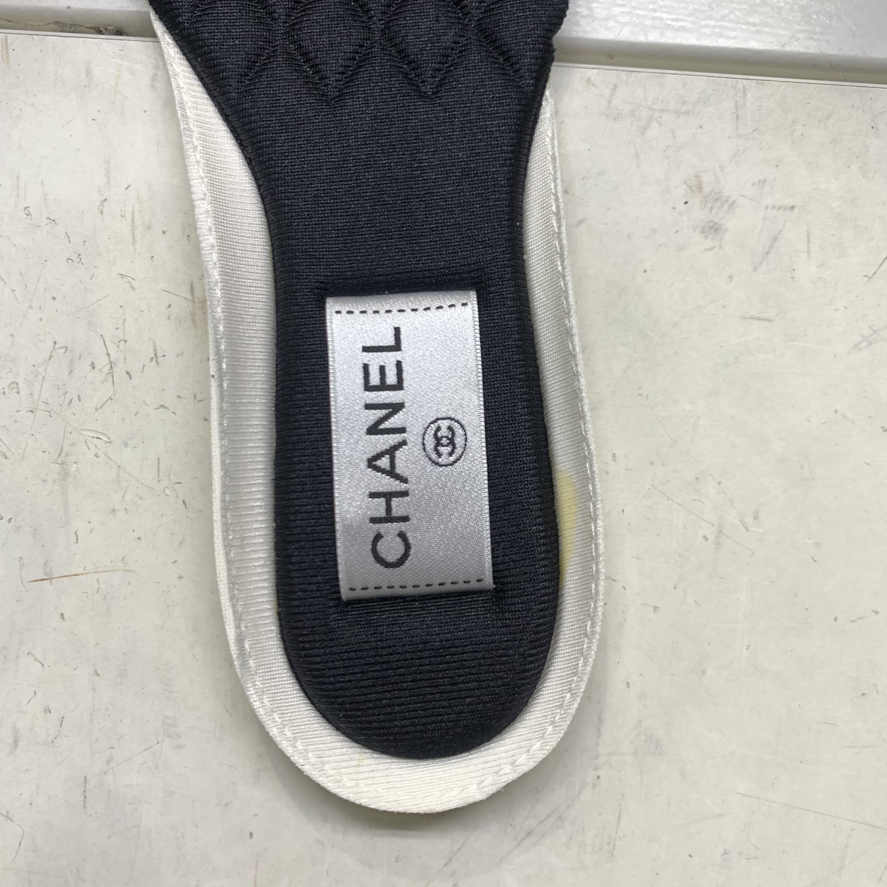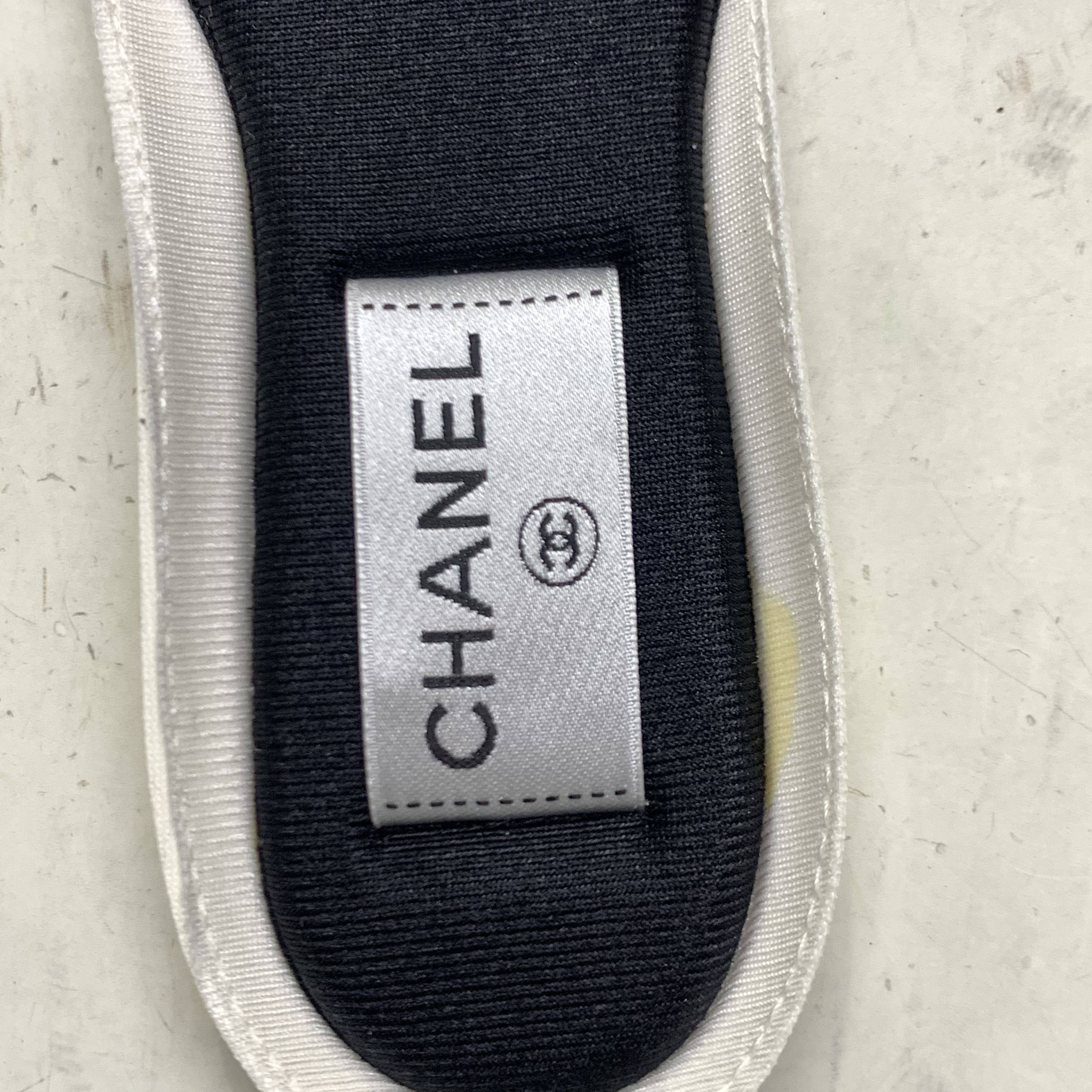 (W) Chanel Sneakers Fabric Laminated & White Gold Silver