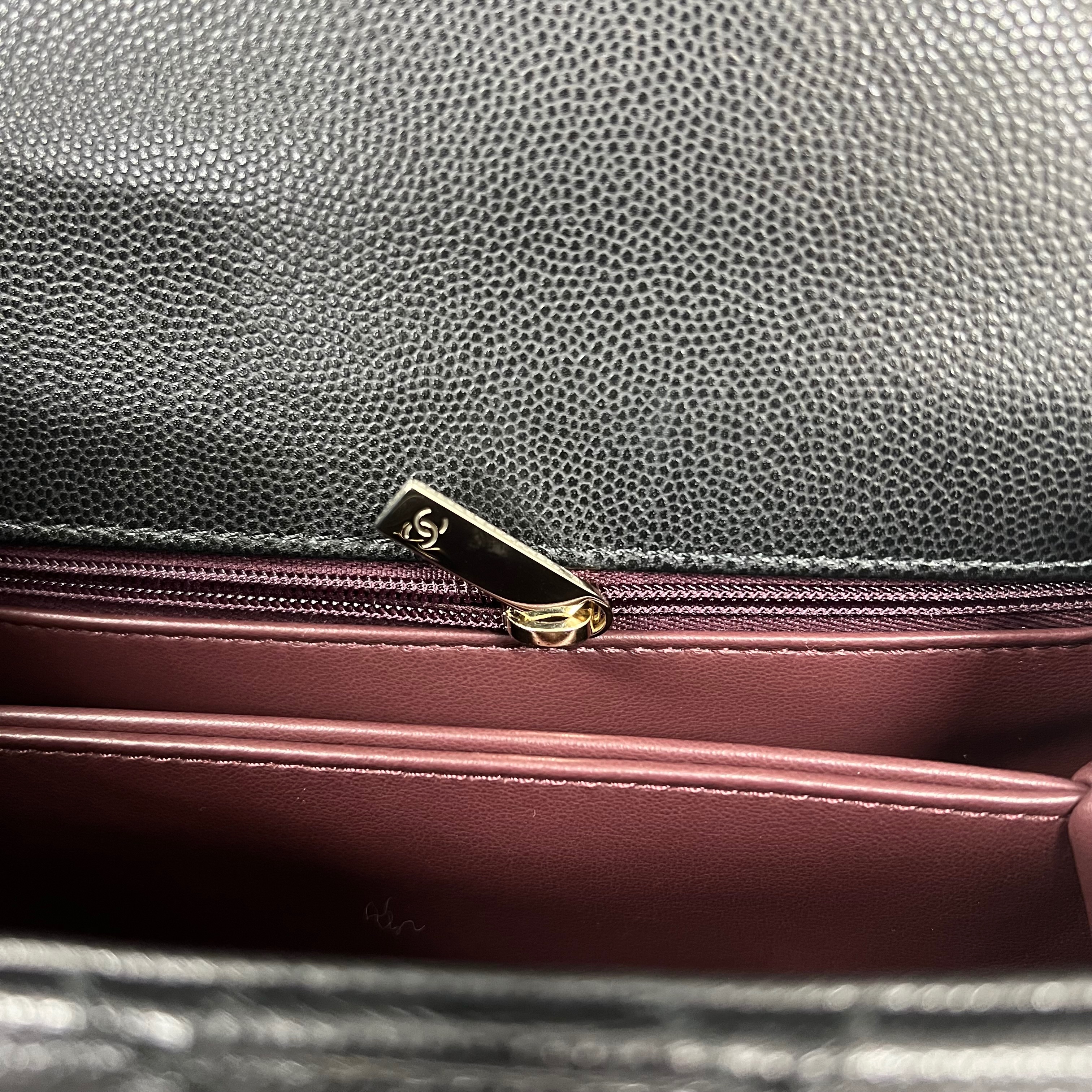 샤넬 핸들 장식의 플랩백 그레인드 카프스킨 & 골드 메탈 블랙