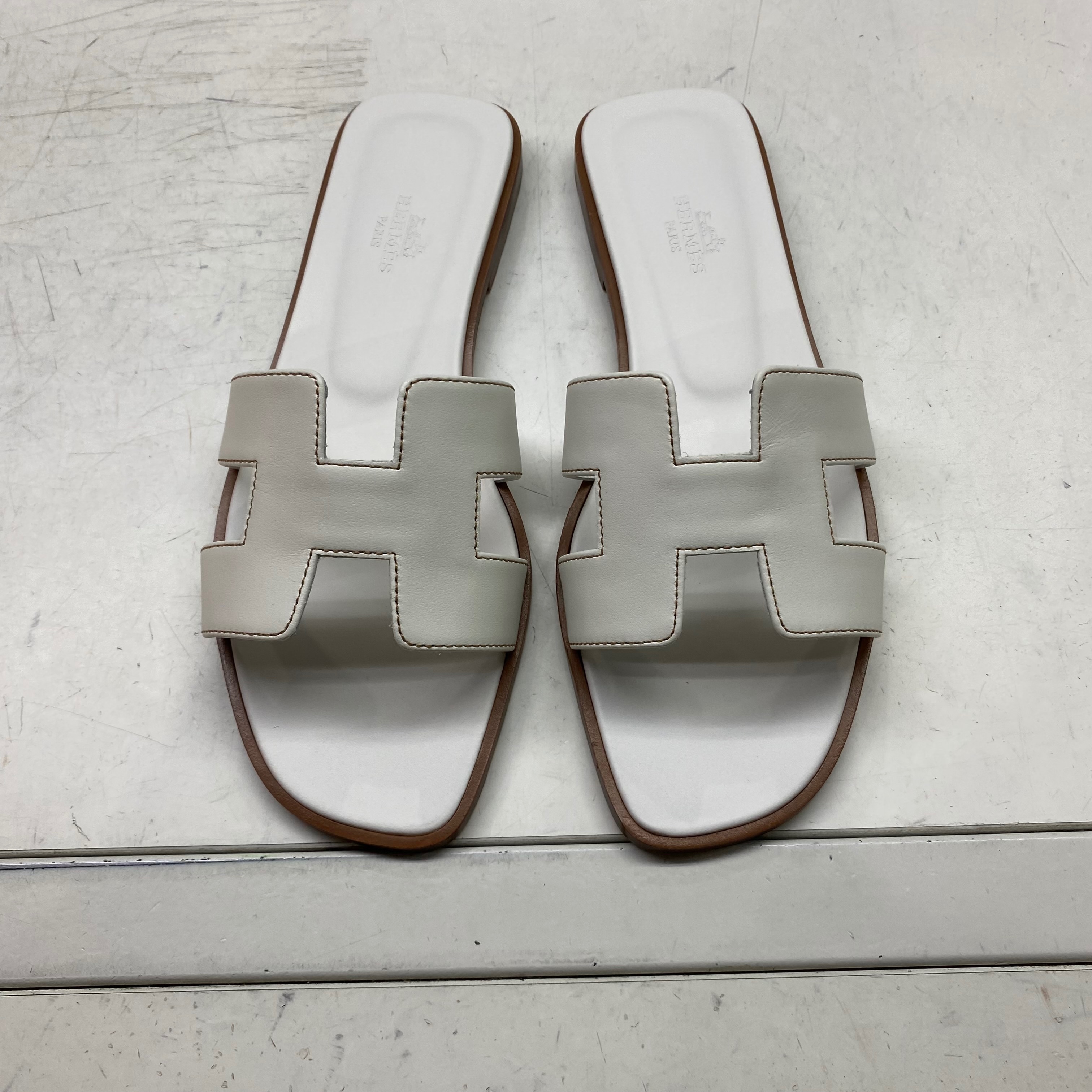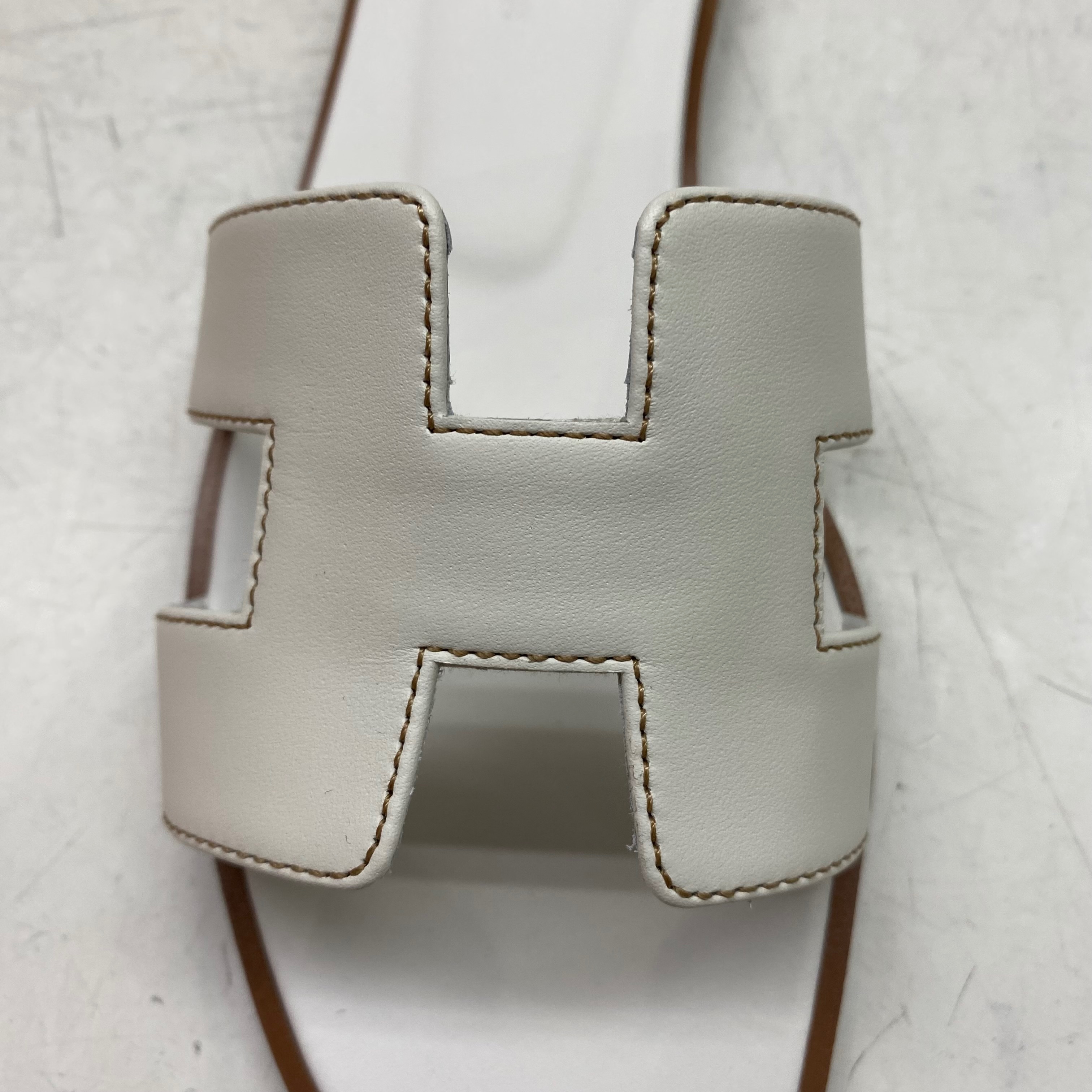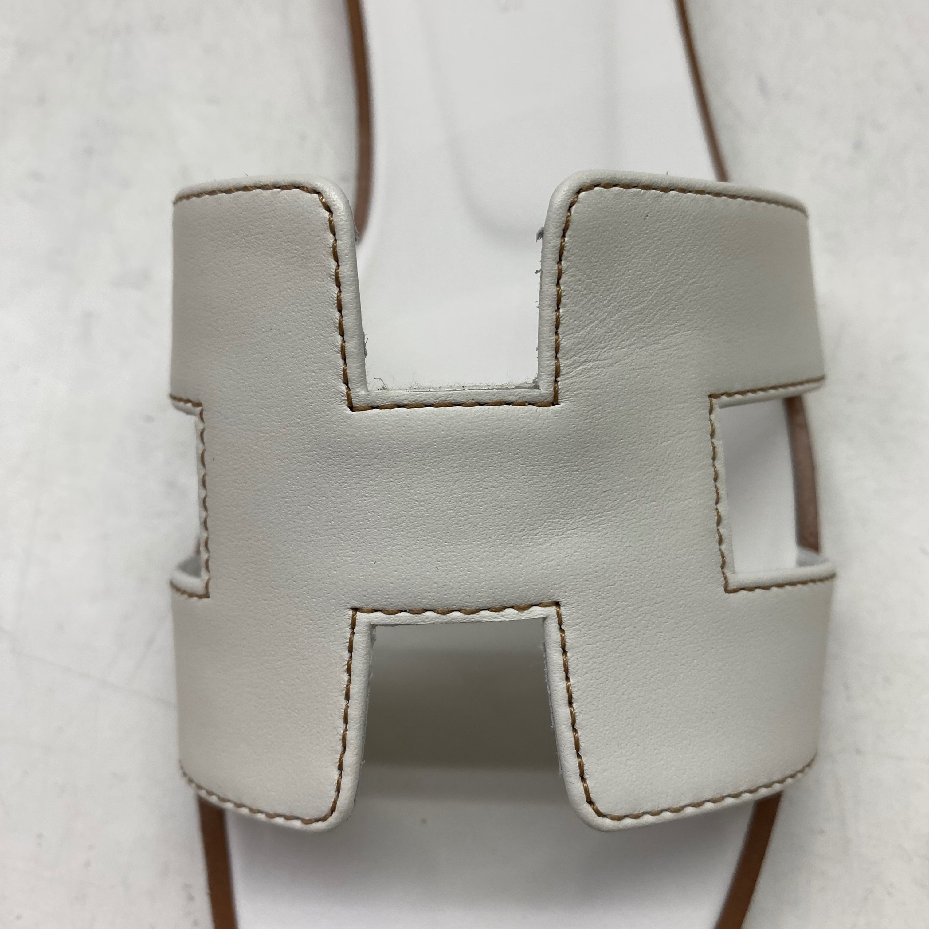(W) Hermes Oran Sandal Calfskin & Blanc Piqures Havane