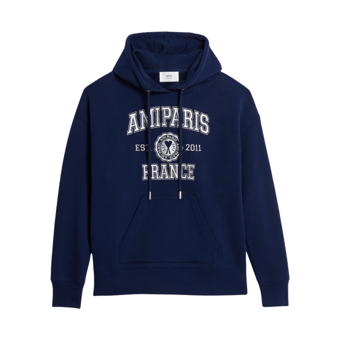 아미 스몰 하트 로고 루프백 오가닉 코튼 플리스 후드 나이트 블루