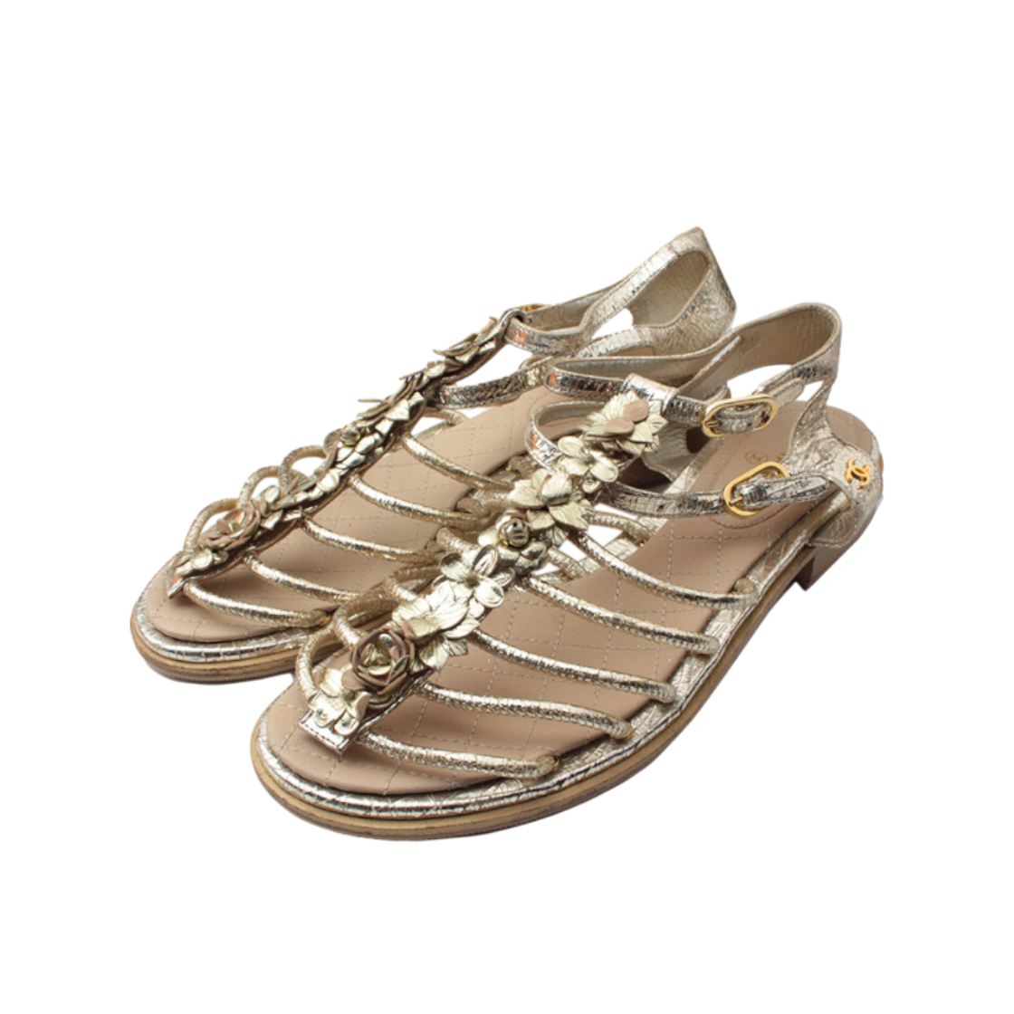 샤넬 까멜리아 샴페인 골드 레더 플랫 샌들 36.5 사이즈
