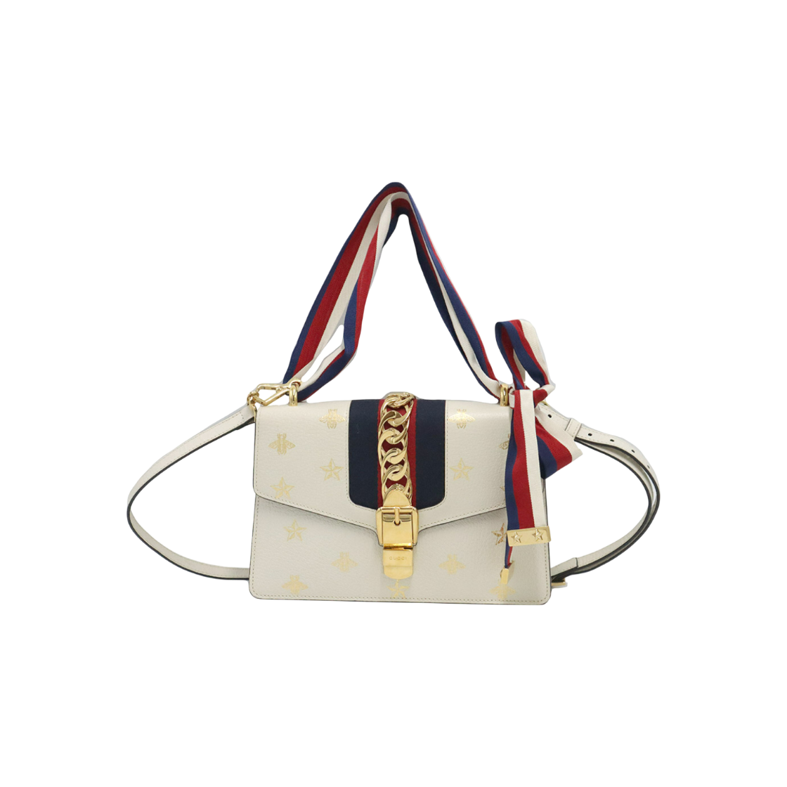 구찌 524405 화이트 레더 웹 장식 금장 실비 비스타 탑핸들 2웨이