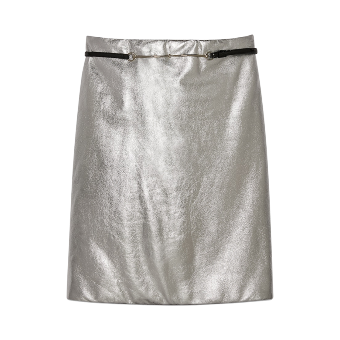 (W) 구찌 패딩 레더 스커트 홀스빗 메탈릭 실버
