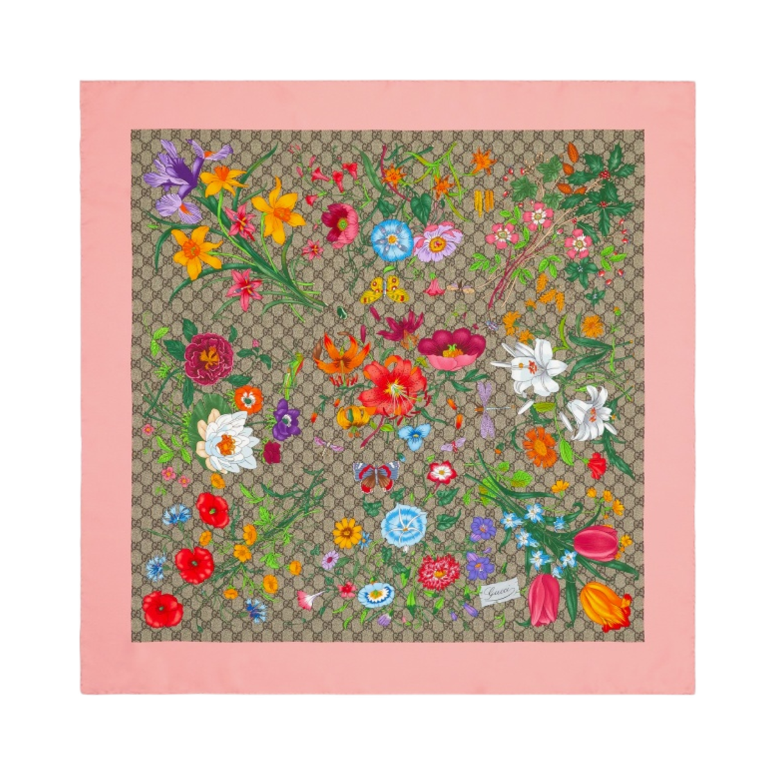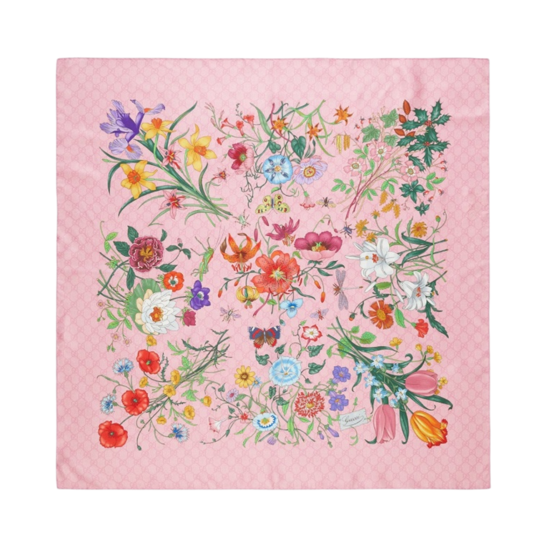 (W) 구찌 플로라 프린트 실크 트윌 스카프 핑크 멀티컬러