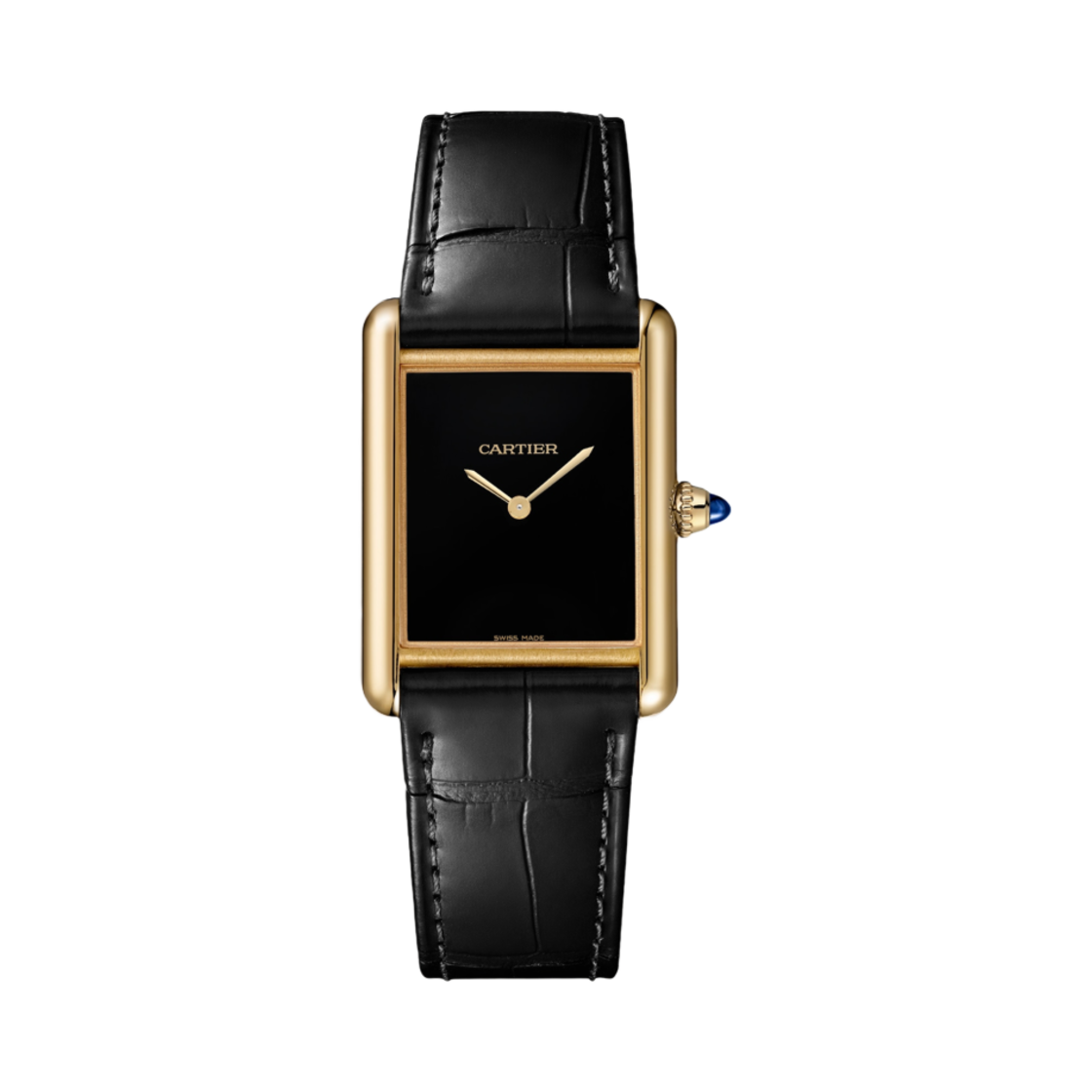 까르띠에 탱크 루이 워치 미니 쿼츠 옐로우 골드 샤이니 앨리게이터 스킨 블랙