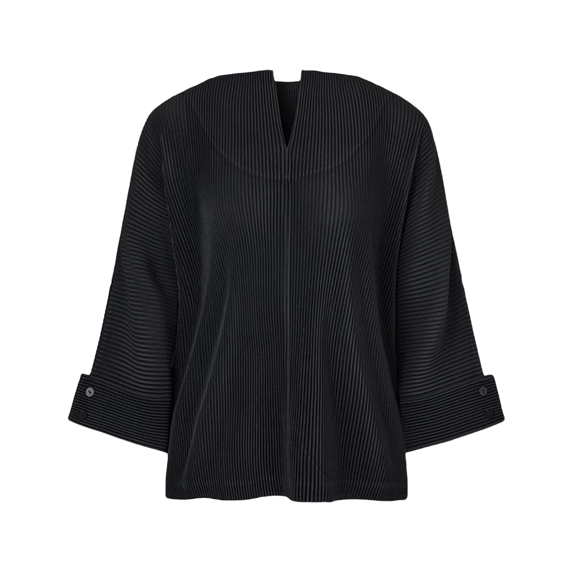 몽플리쎄 여성 오픈 카라 7부 소매 플리츠 블라우스 블랙