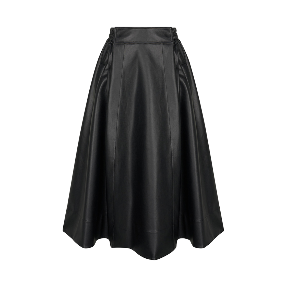 노이스 풀 플레어드 페이크 레더 미디 스커트 블랙