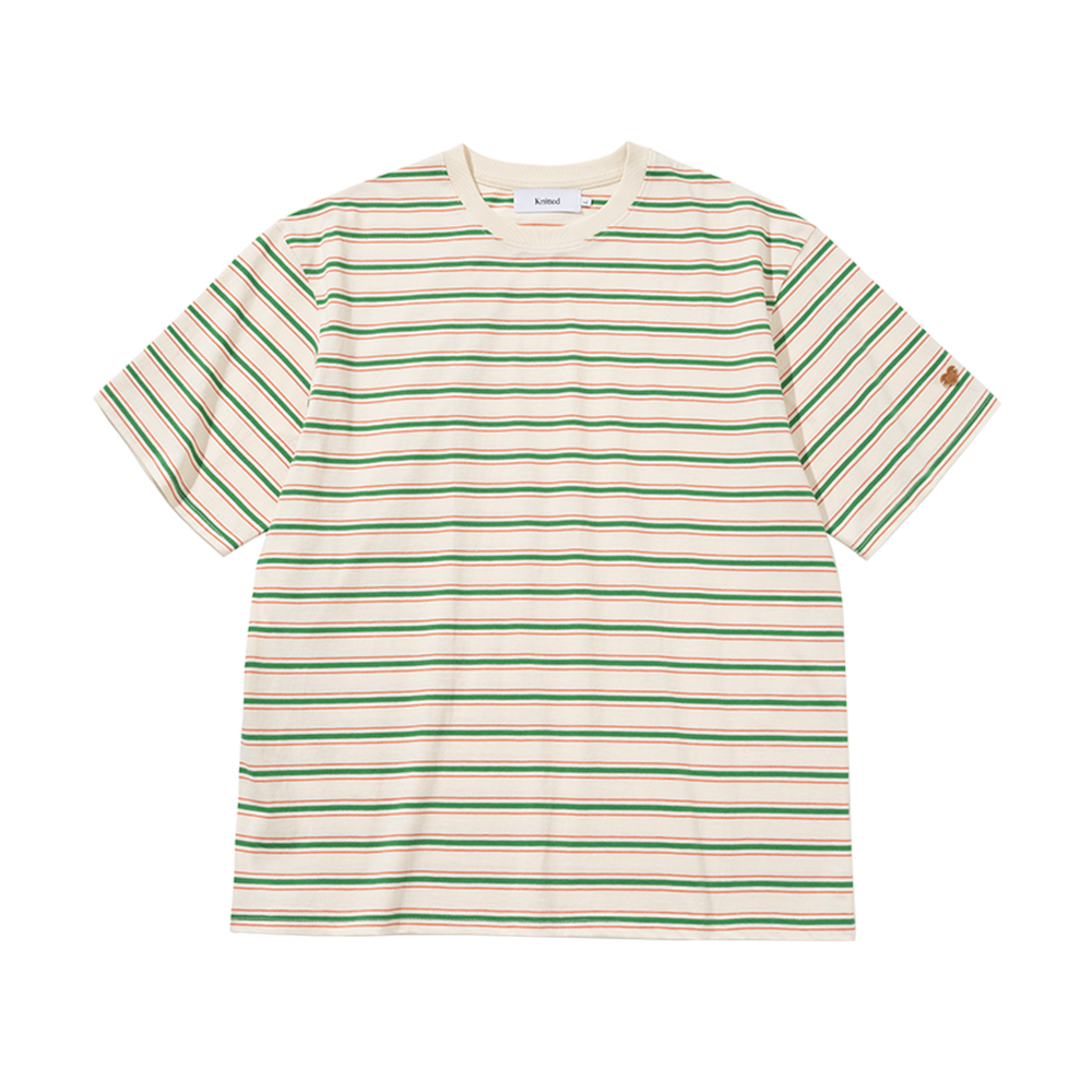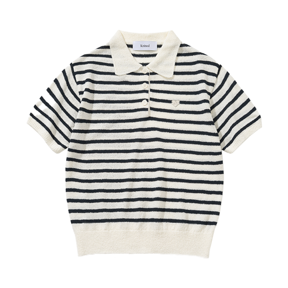 니티드 스트라이프 레더 하트 티셔츠 크림