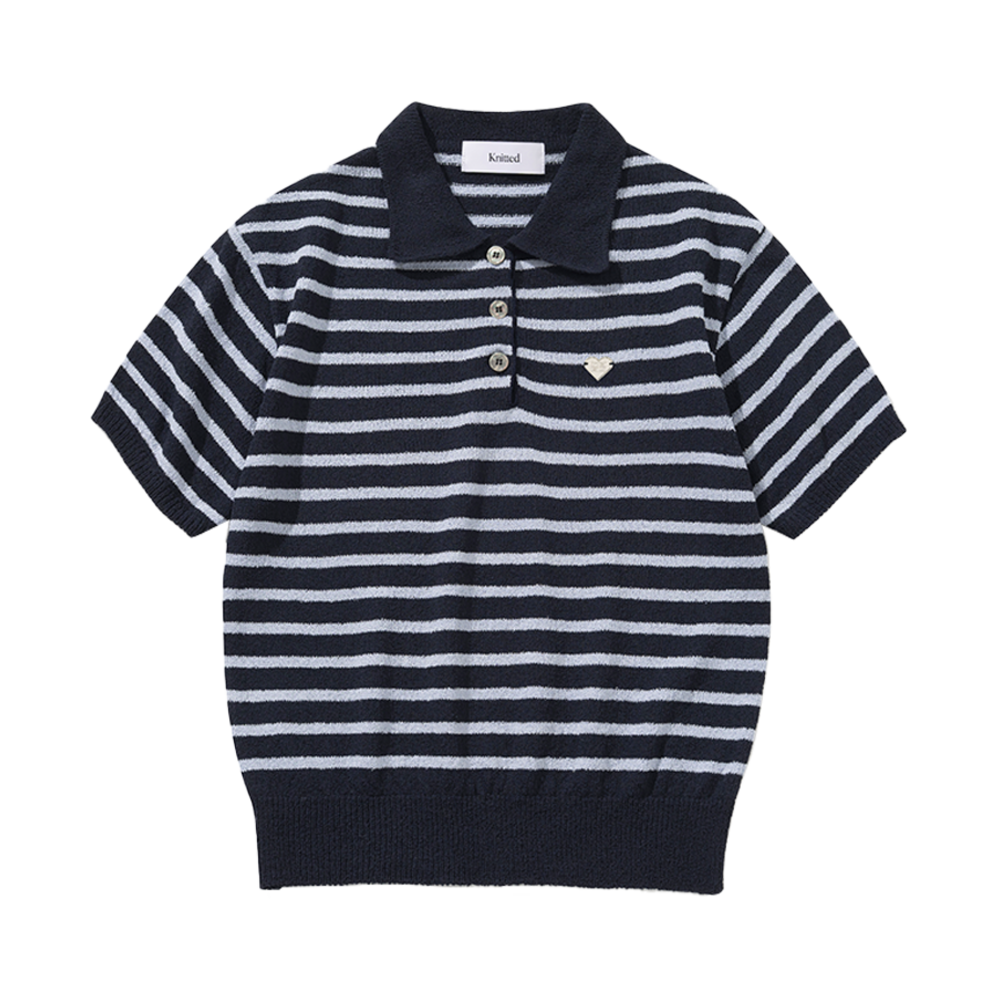 니티드 여성 부클 스트라이프 카라 니트 네이비