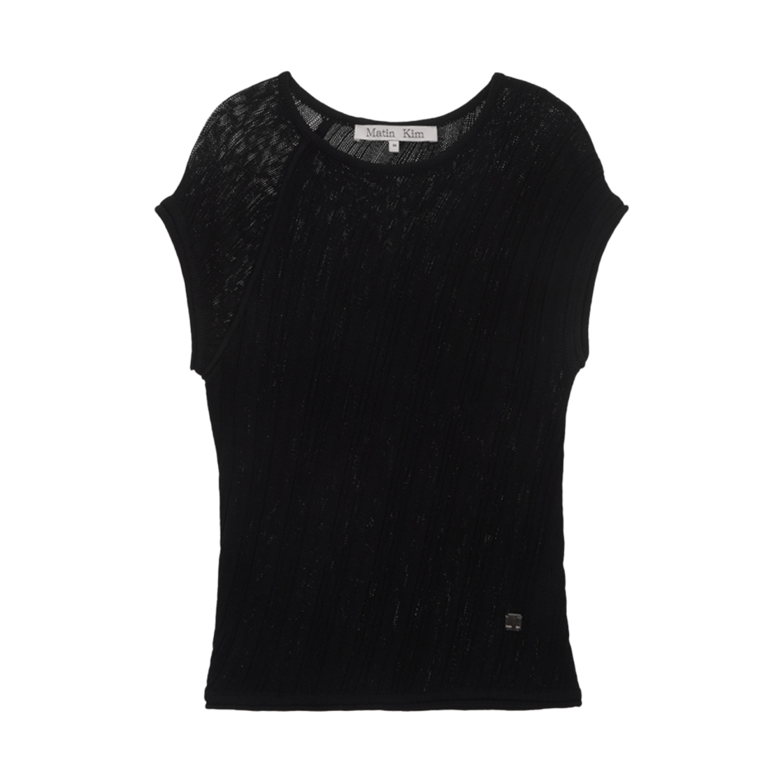 (W) 마뗑킴 다이애그널 텍스쳐 하프 슬리브 니트 탑 블랙