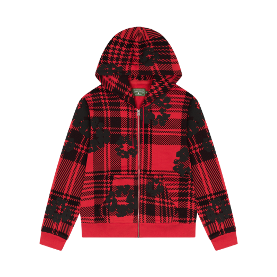 데님 티어스 플레이드 코튼 리쓰 집 후드 레드