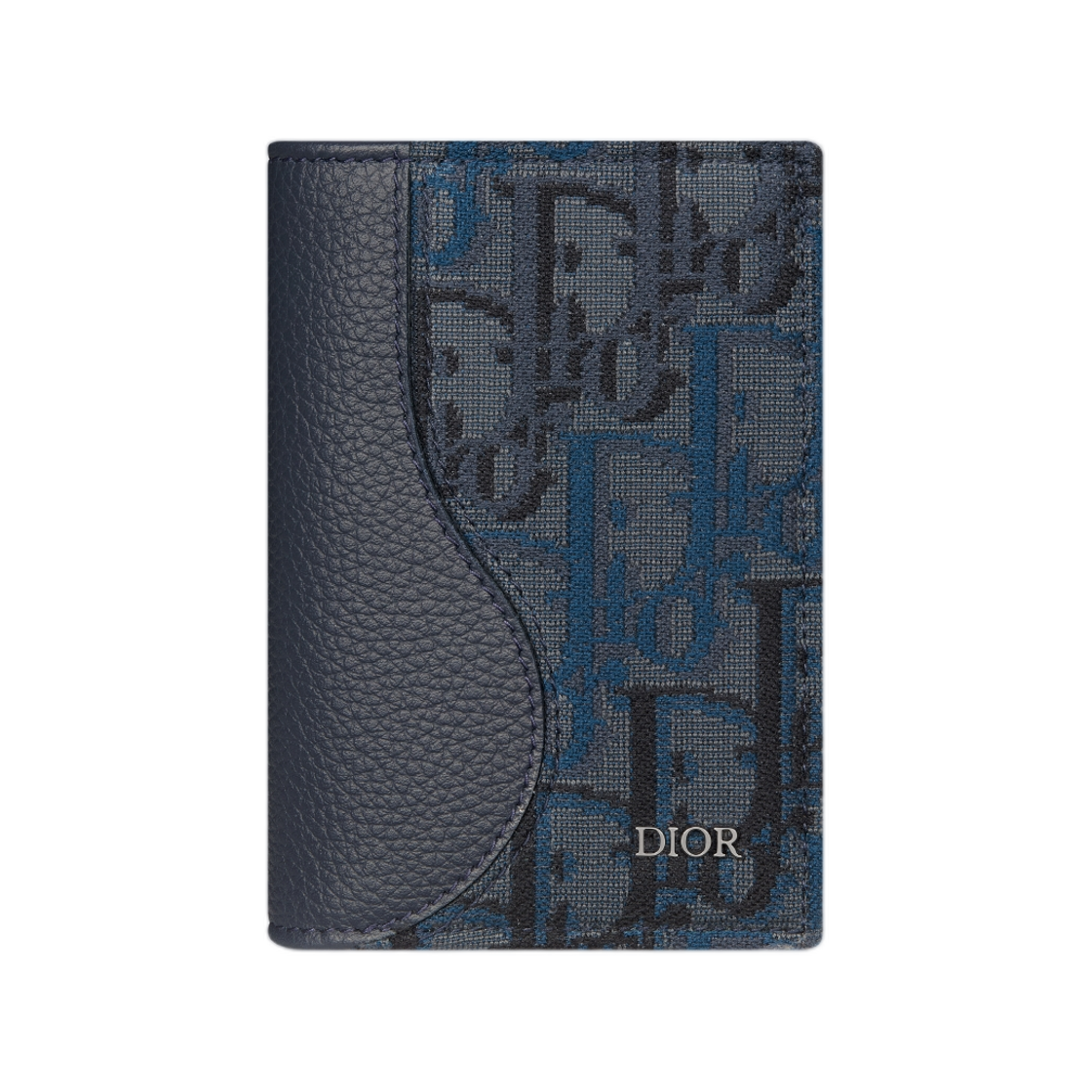 디올 새들 버티컬 바이폴드 카드 홀더 그레인드 카프스킨 & 디올 오블리크 트리오 자카드 마르퀘트리 딥 블루 딥 블루
