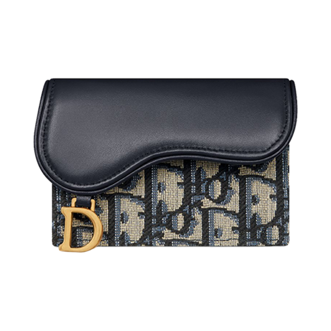 디올 새들 블룸 카드 홀더 블루 디올 오블리크 자카드 앤 스무스 카프스킨