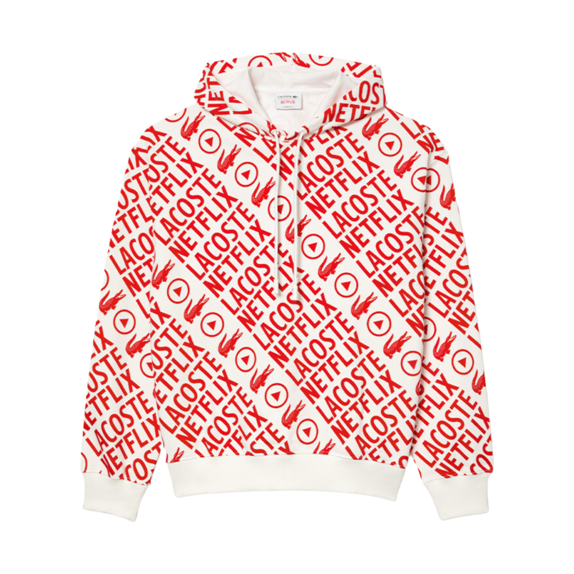라코스테 x 넷플릭스 올오버 프린트 후드 스웨트셔츠 화이트 레드
