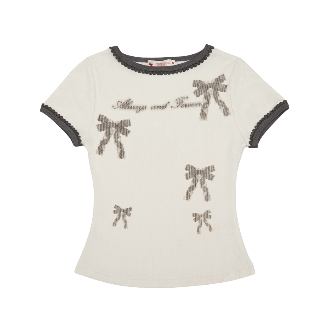 로긴 앤 로지 리본 프린티드 라운드 숄더 티셔츠 아이보리