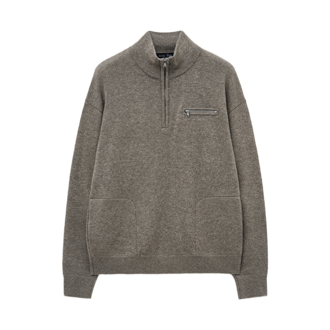 마뗑킴 백 로고 하프 니트 집업 풀오버 다크 베이지